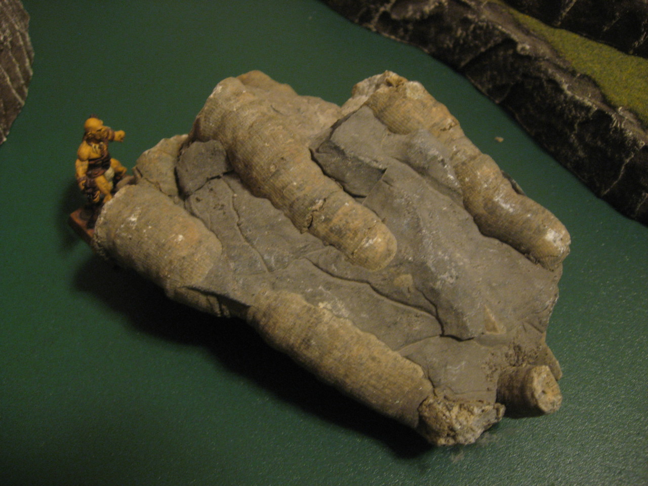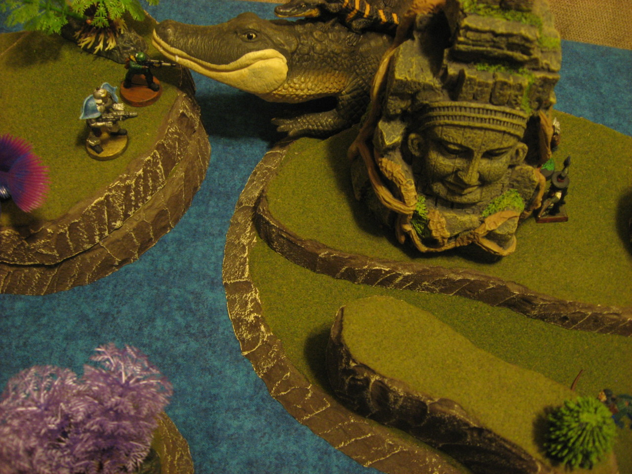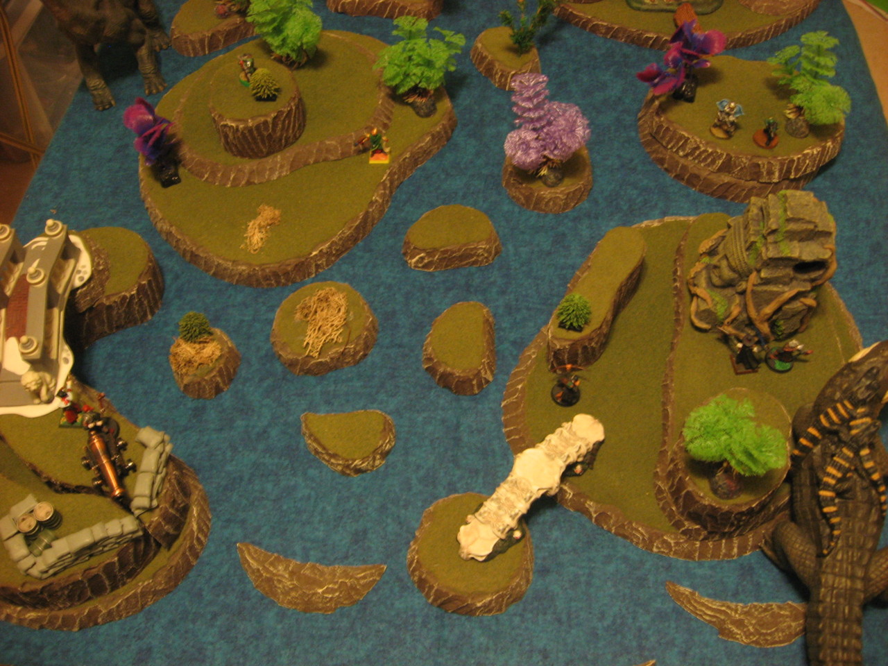 The central feature of the table was the crashed and decaying F-14 Tomcat. I used a bunch of trailing rocks to make a slide/crash zone and hopefully give some sense of weight to the plane. The pilot was likely heading for the softer jungle at the edge of the table, but fell short and crashed into a solid stone hill. Otherwise an old corral/pen containing barrels and a sabertooth skeleton, a few hills and the usual trees, and the table was set.
