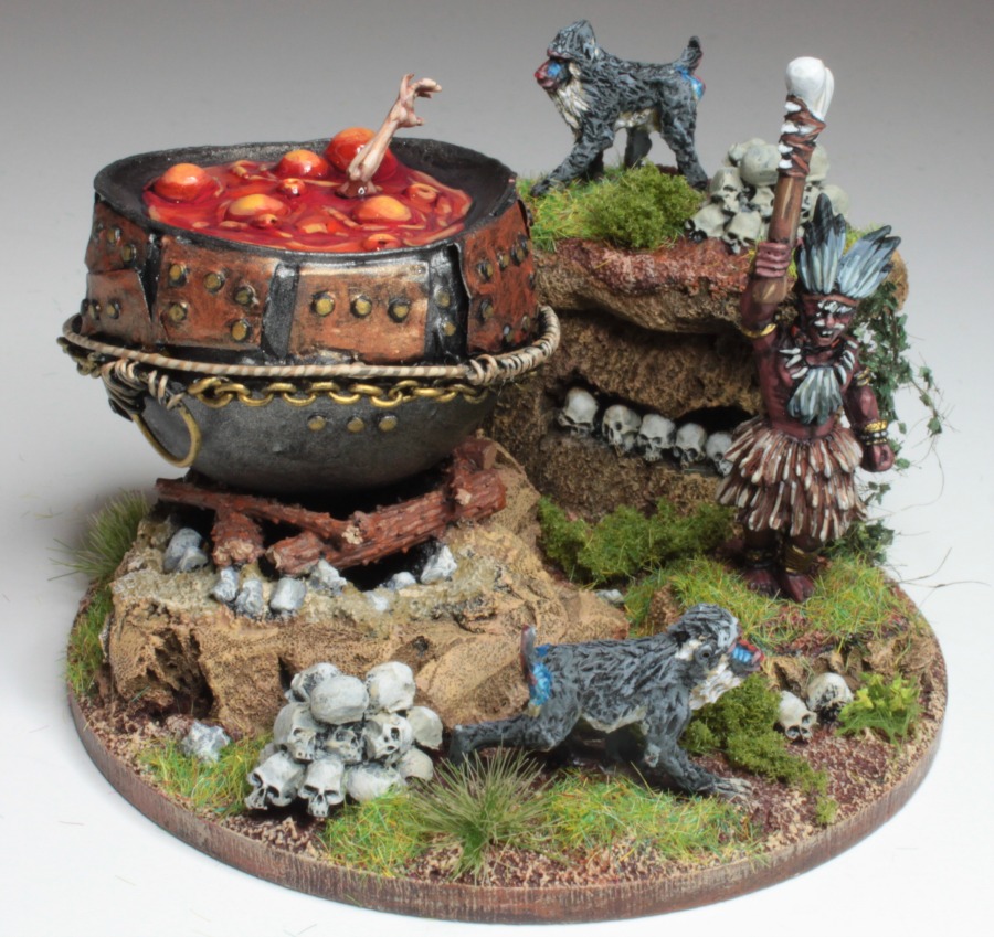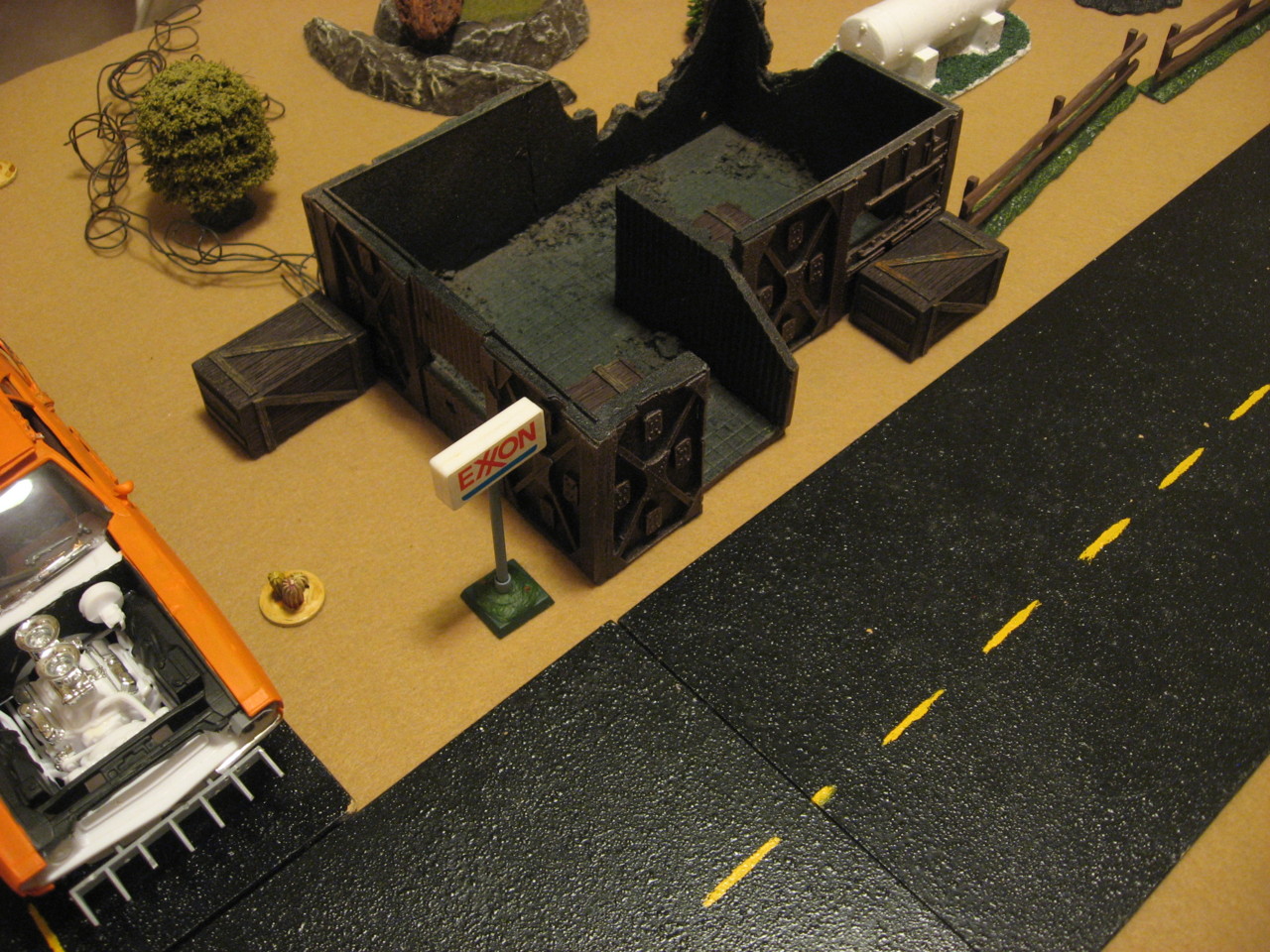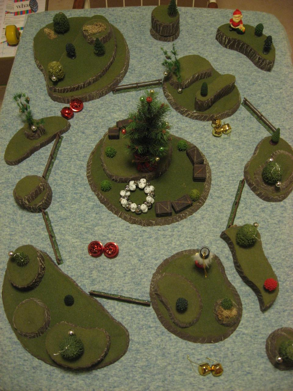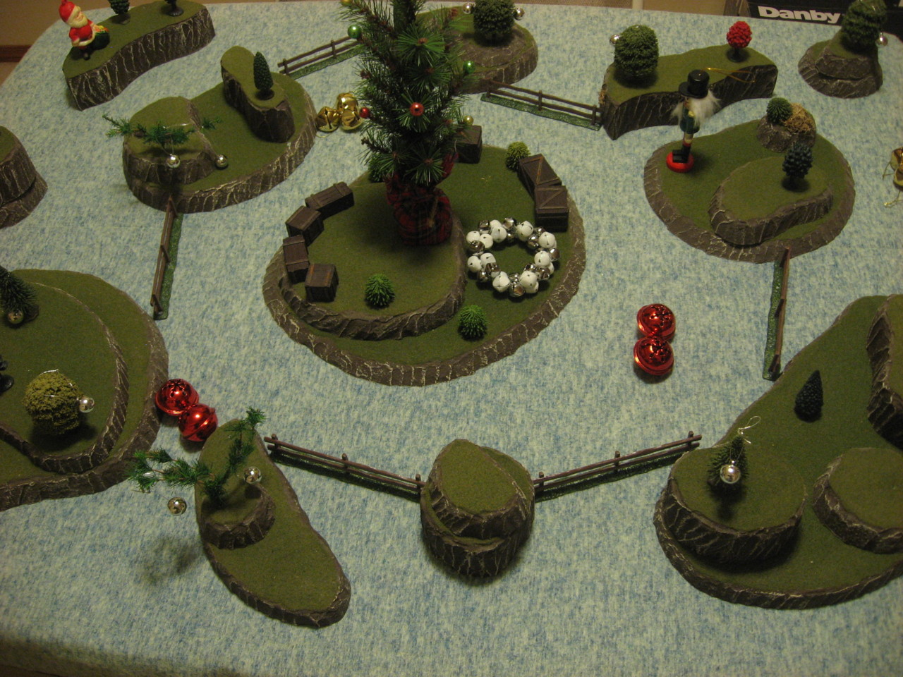 The central feature of the table was the crashed and decaying F-14 Tomcat. I used a bunch of trailing rocks to make a slide/crash zone and hopefully give some sense of weight to the plane. The pilot was likely heading for the softer jungle at the edge of the table, but fell short and crashed into a solid stone hill. Otherwise an old corral/pen containing barrels and a sabertooth skeleton, a few hills and the usual trees, and the table was set.