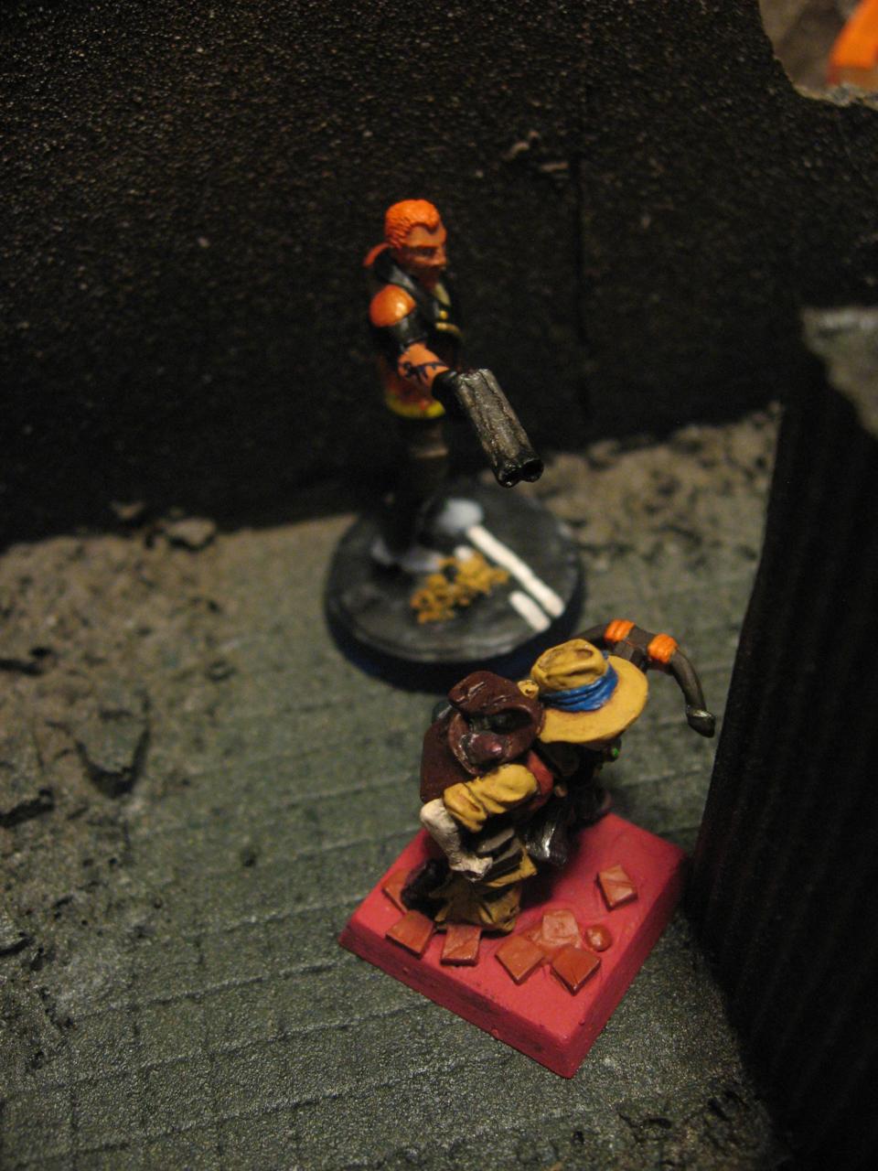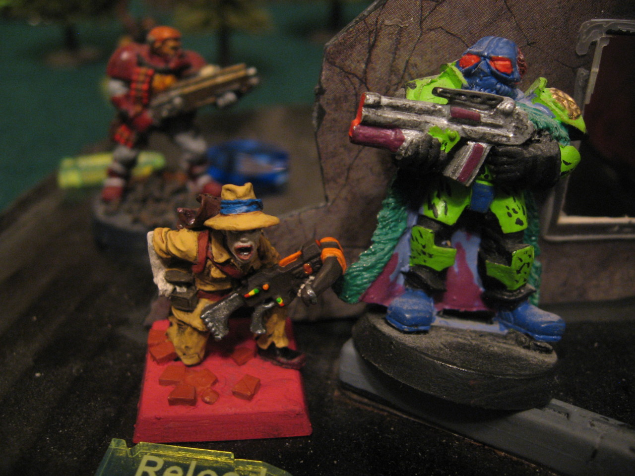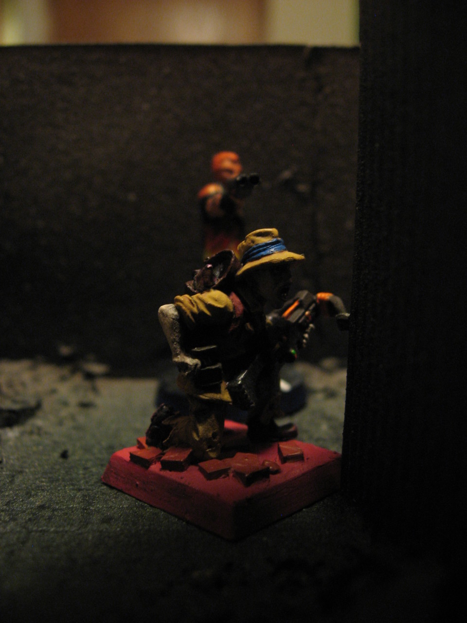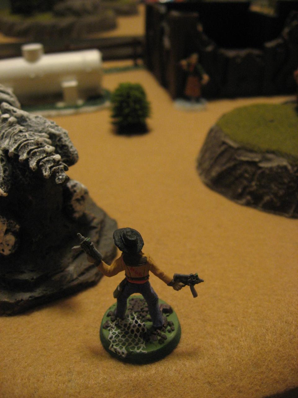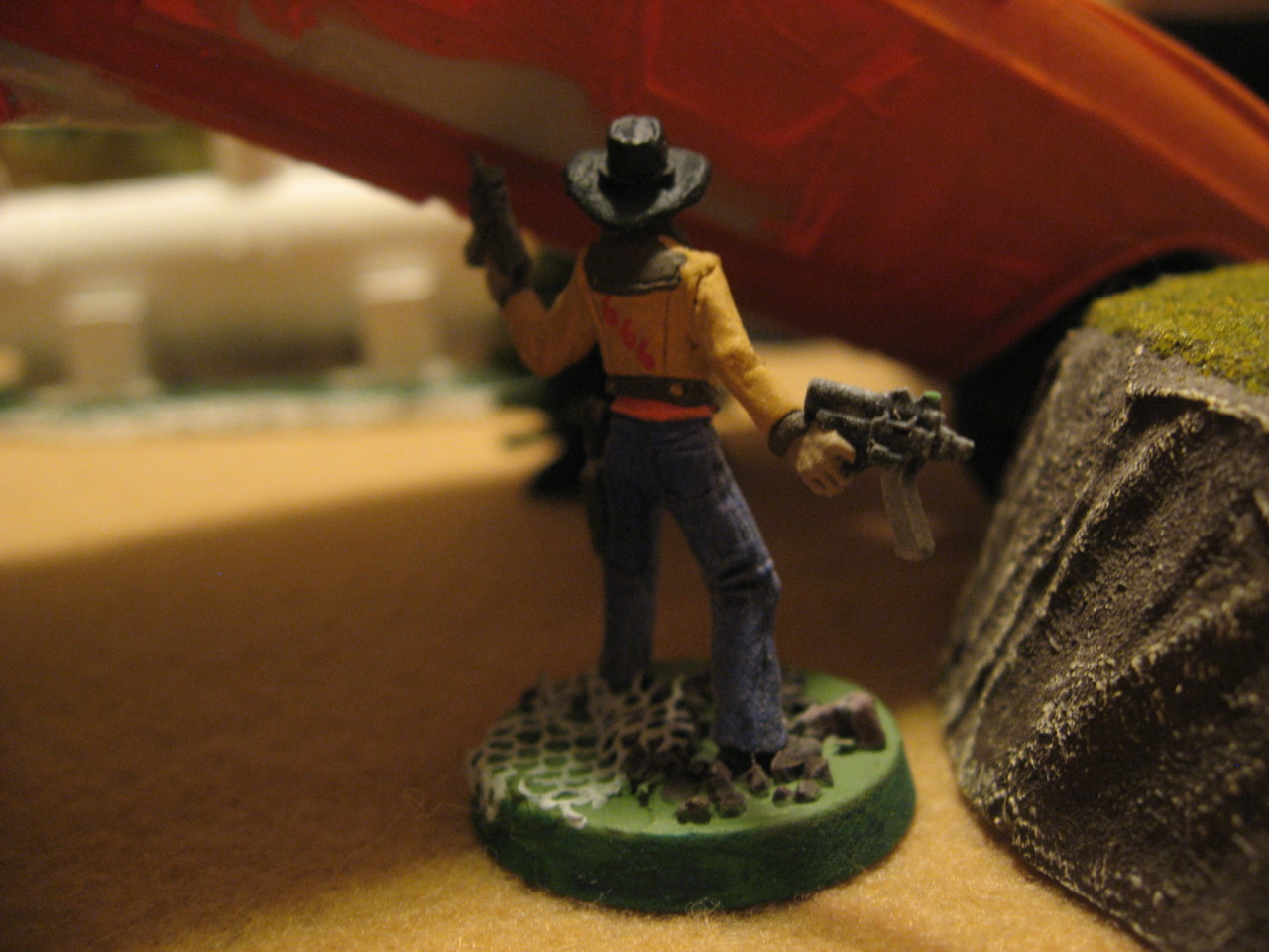 I think this is the debut of one of my new-ish (notice a trend?) miniature that looks vaguely like Clint Eastwood from his spaghetti westerns. I mean not as much as another mini I have, but certainly a generic looking cowboy fellow. I had painted a “fan the hammer glove” on his hand, to help grip the hammer. Otherwise the miniatures should look familiar, except maybe the defector Plague Marine. He was actually from an old, old game I wrote called “Twilight” (yes, before the movies), which is why he’s customized for an RPG and on a hex base.