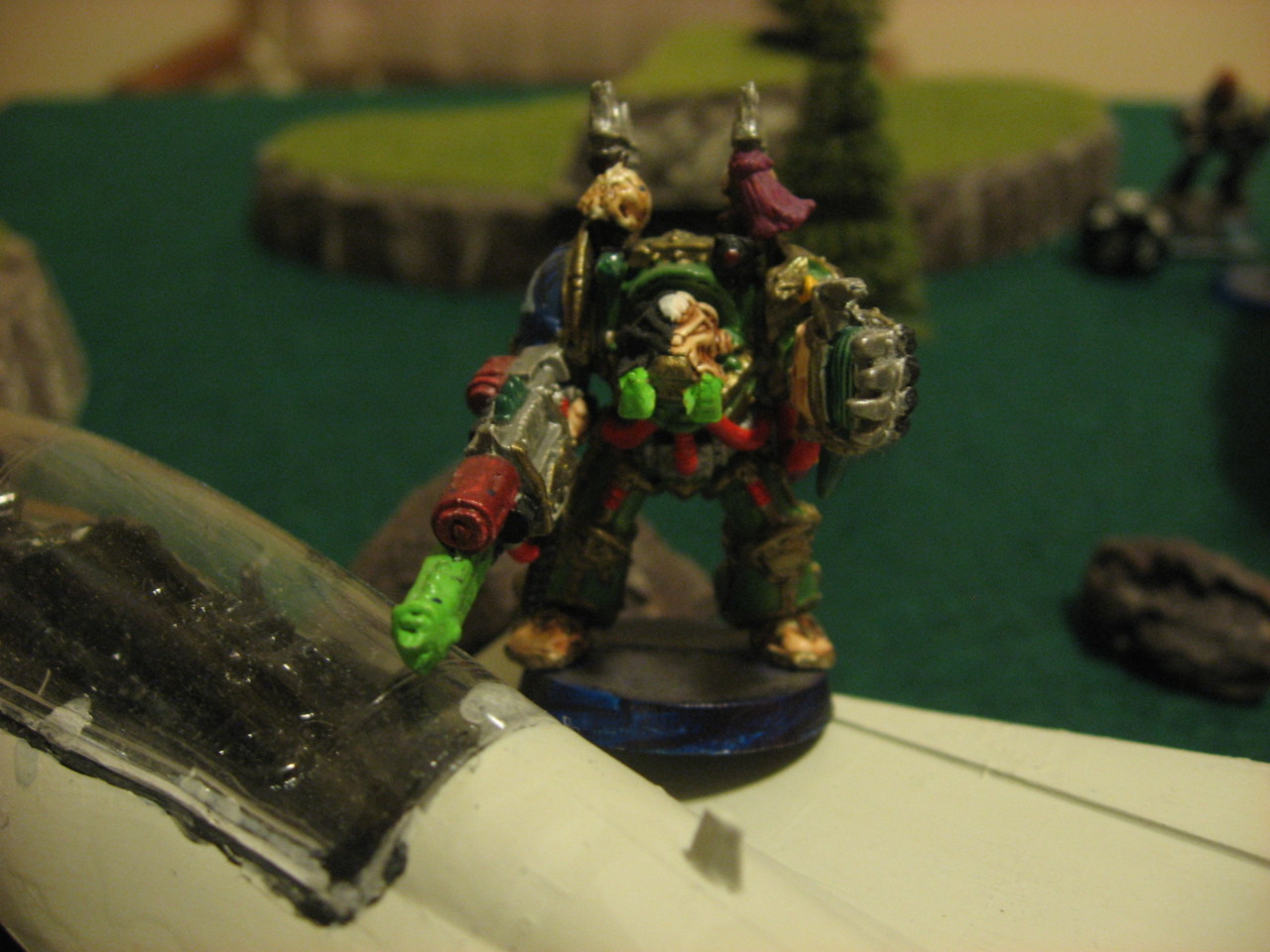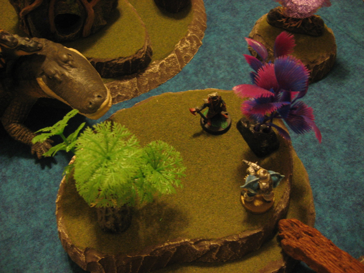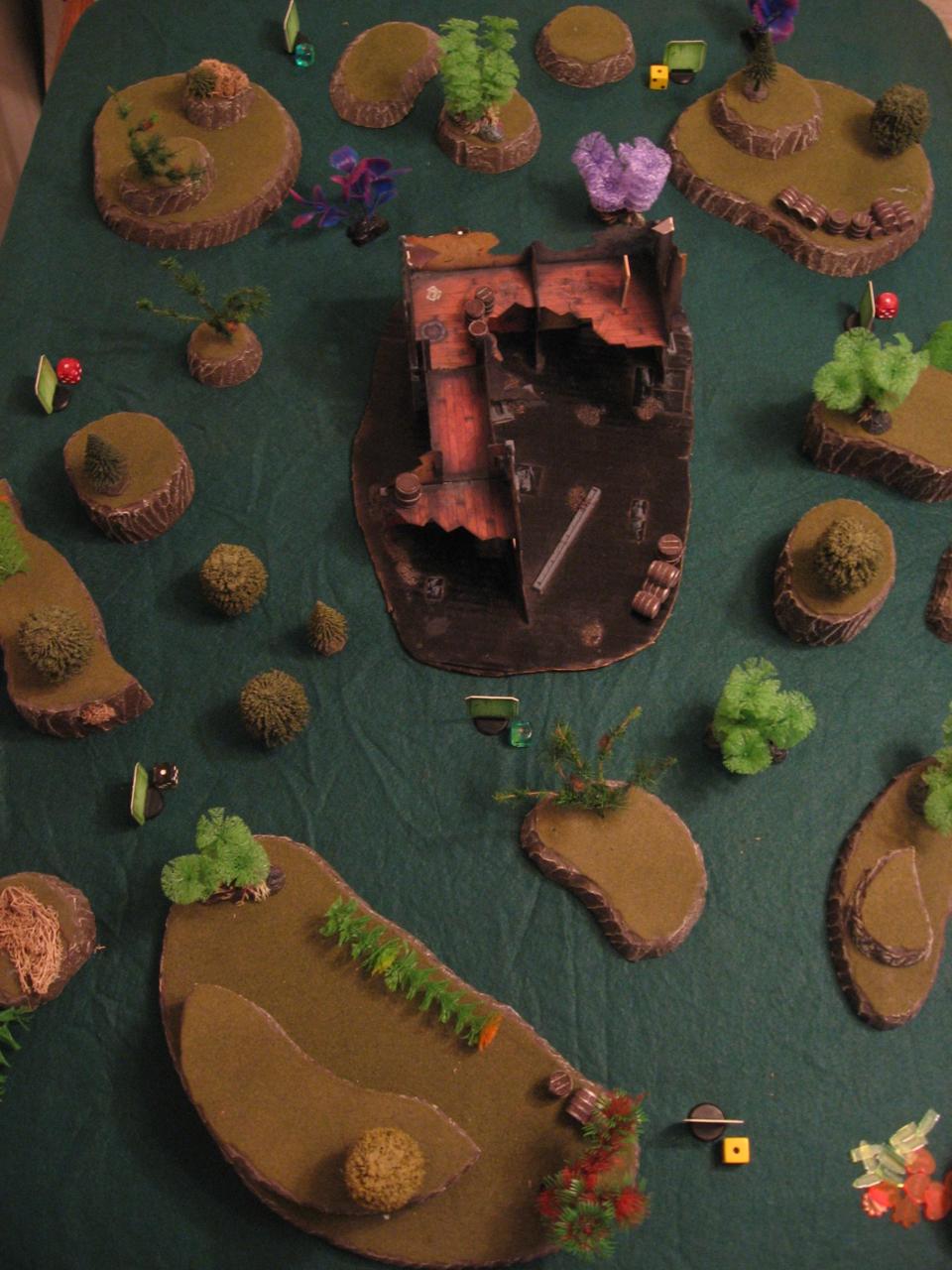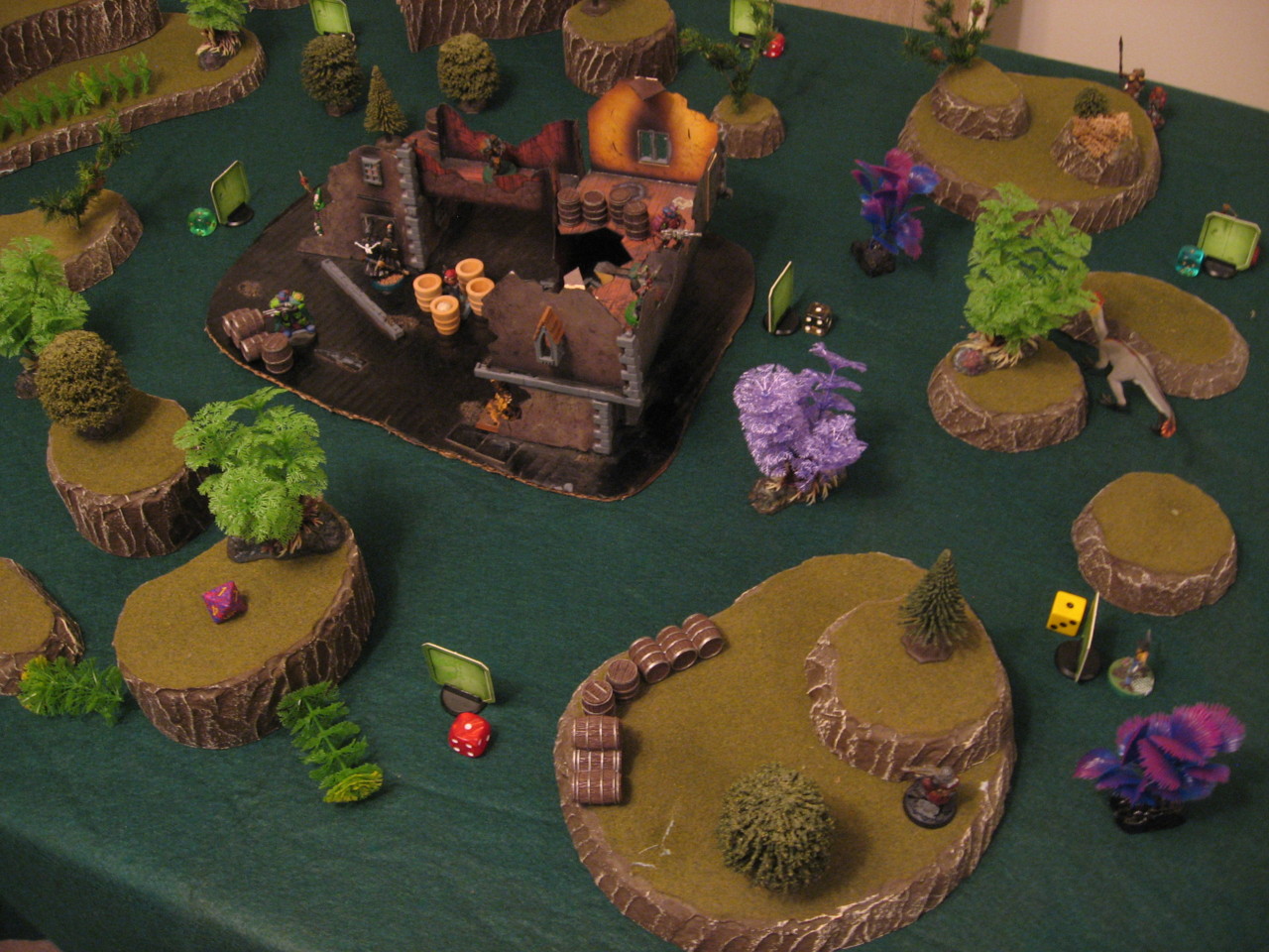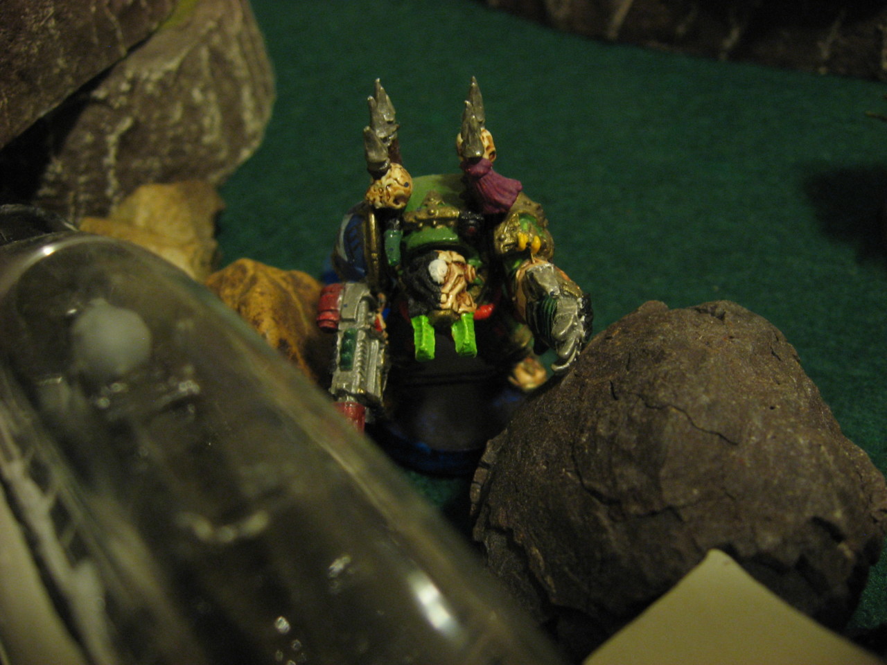 I think this is the debut of one of my new-ish (notice a trend?) miniature that looks vaguely like Clint Eastwood from his spaghetti westerns. I mean not as much as another mini I have, but certainly a generic looking cowboy fellow. I had painted a “fan the hammer glove” on his hand, to help grip the hammer. Otherwise the miniatures should look familiar, except maybe the defector Plague Marine. He was actually from an old, old game I wrote called “Twilight” (yes, before the movies), which is why he’s customized for an RPG and on a hex base.