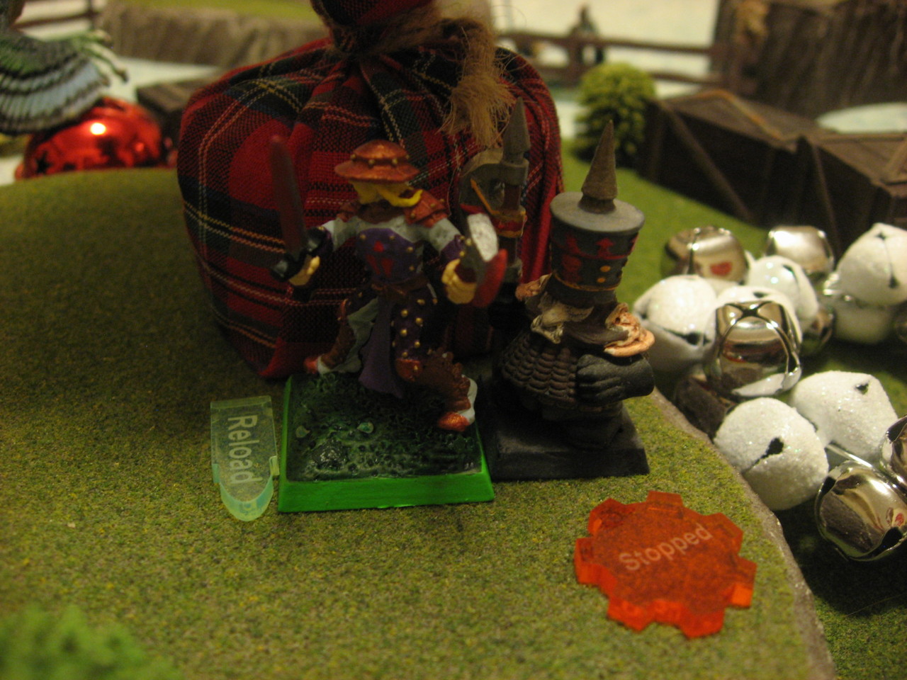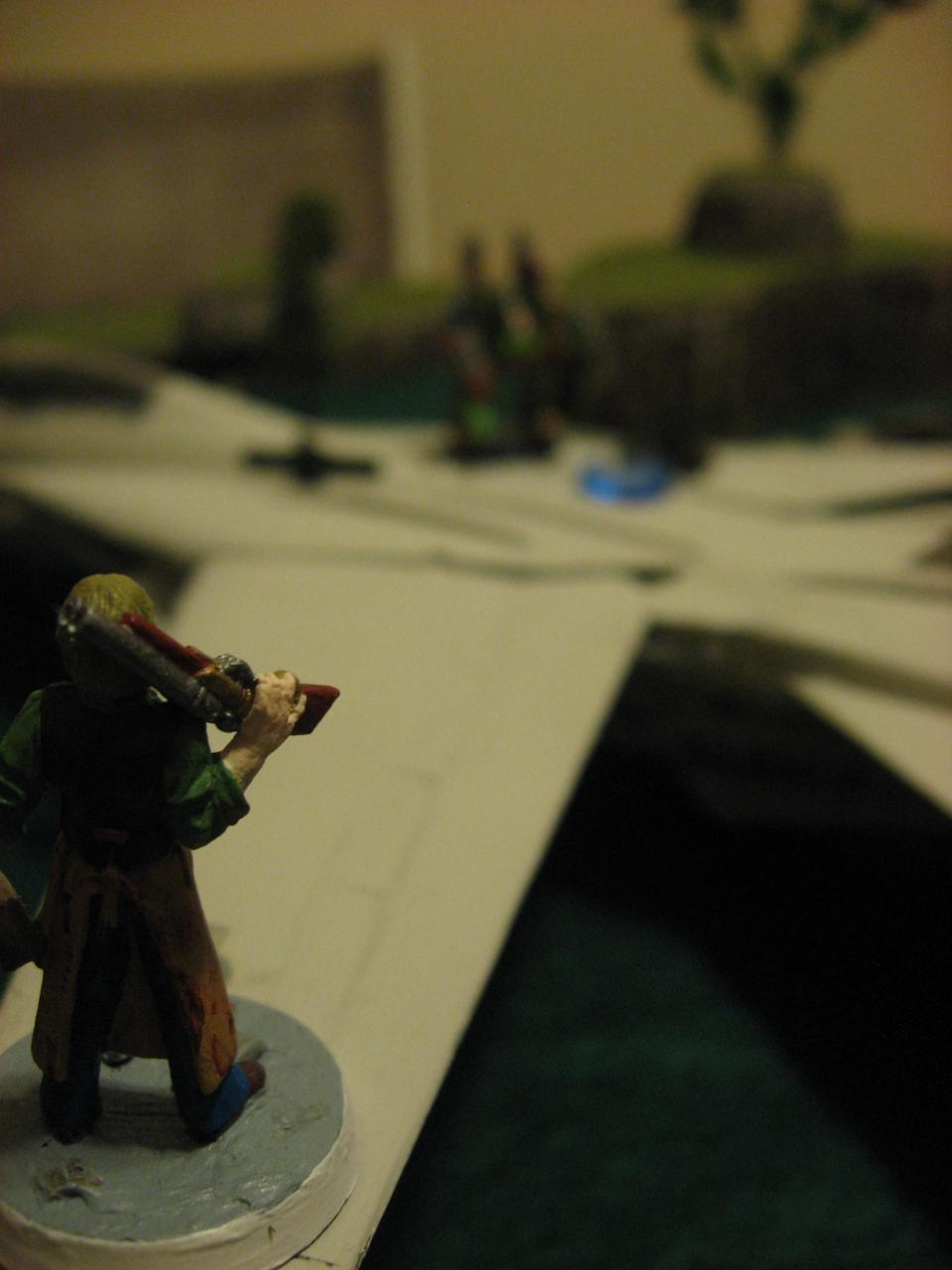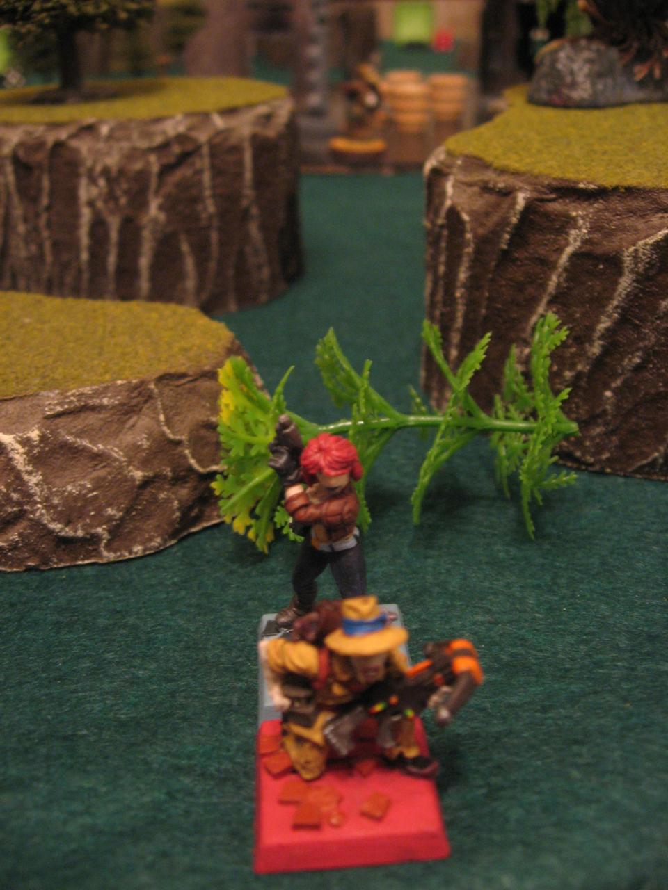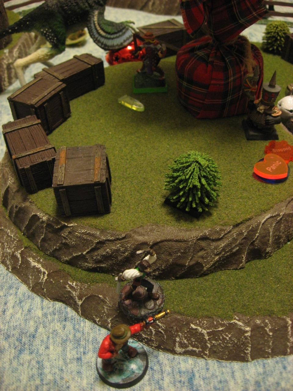 The turn starts well in that regard as the Eastwood Rovers win initiative and have to activate first. Powder Monkey moves to the edge of the stone hill and tries his Bronto Gun, needing a mere 8+ to hit. No luck, a miss!