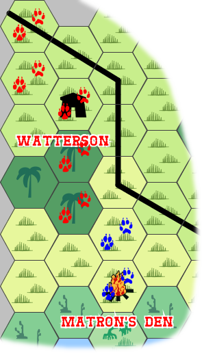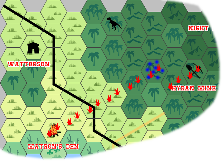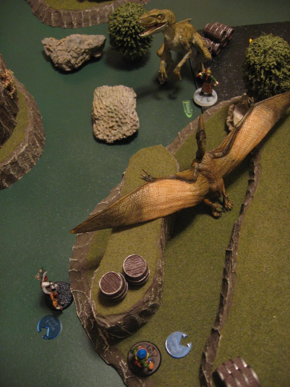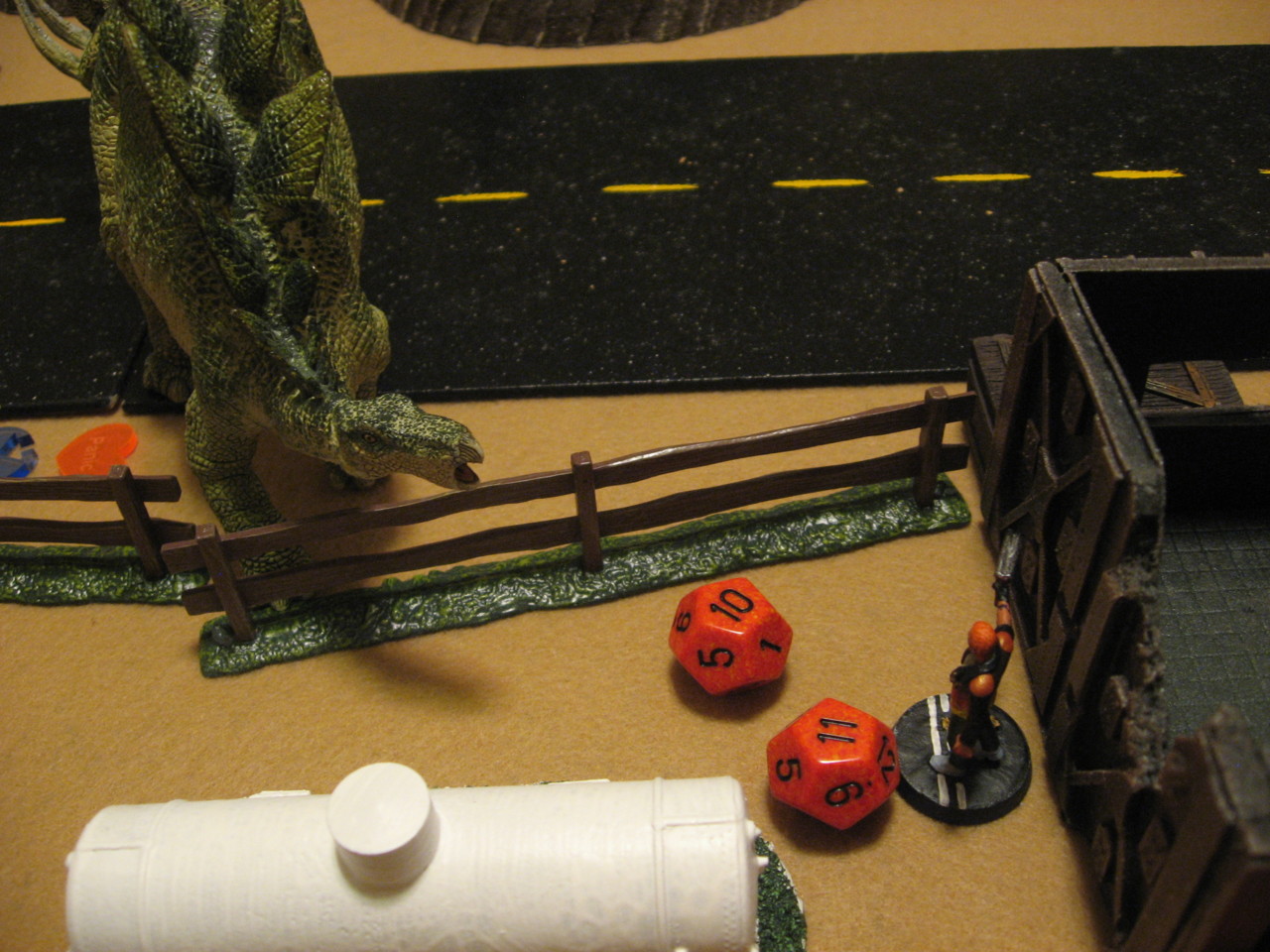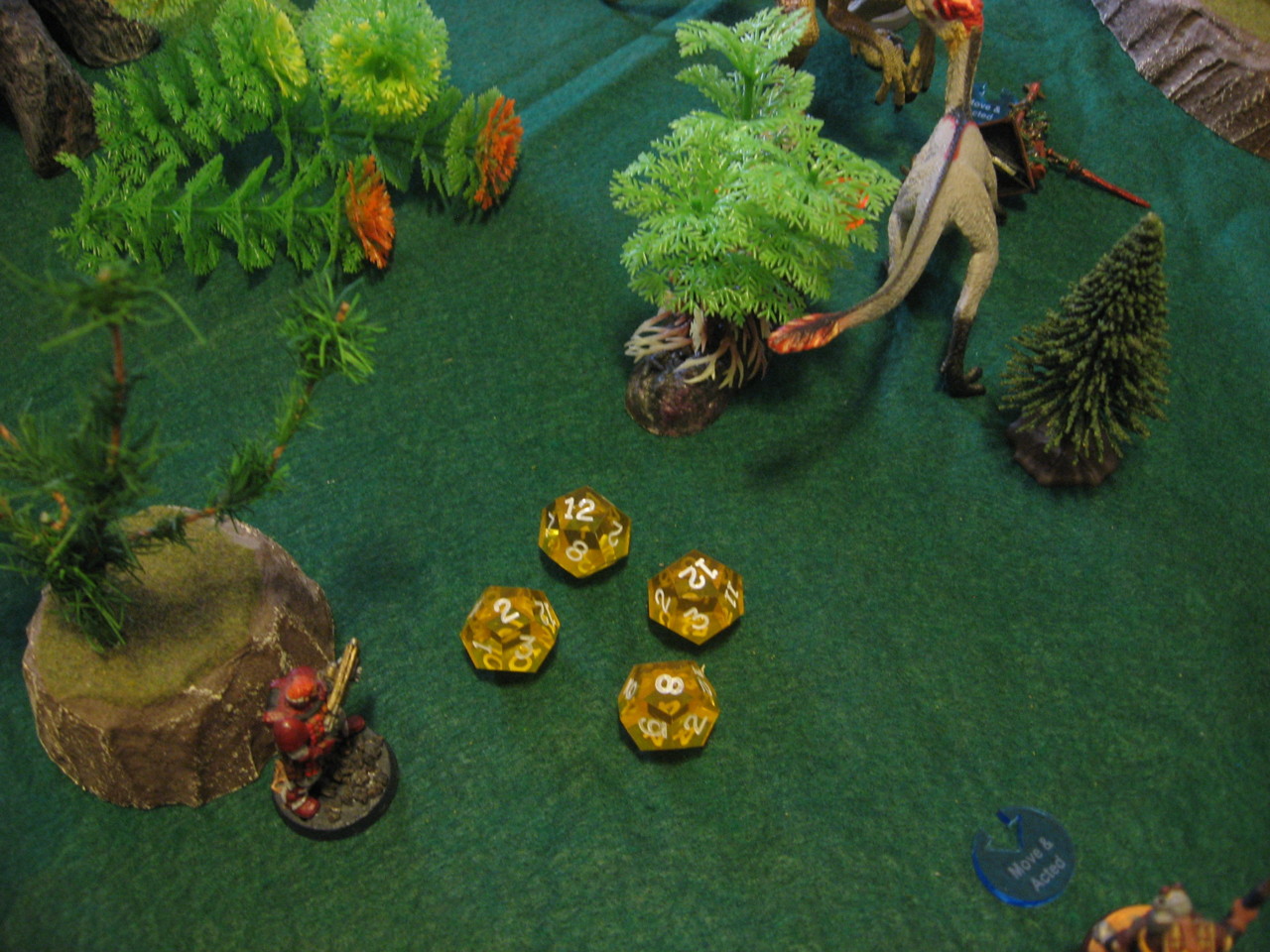 Both dinosaurs were in rough shape after being the focus of various attacks. Dominator rushed out from under the plane wing, used his Berserker trait for +2 Attacks, and managed a Charge against Iron Talon. The Cutlass did solid work, hitting for 9 damage, which left the surprised Iron Talon with a mere 1 Hitpoint. The dinosaur Panicked at this.