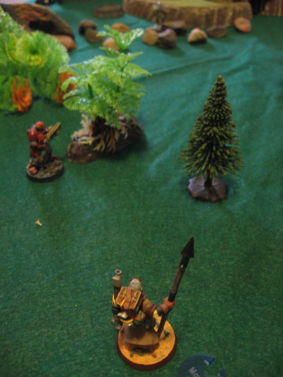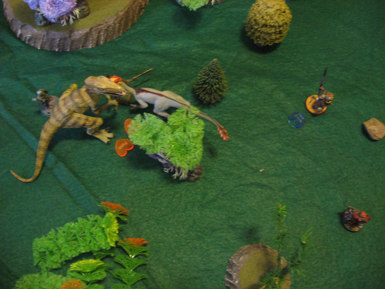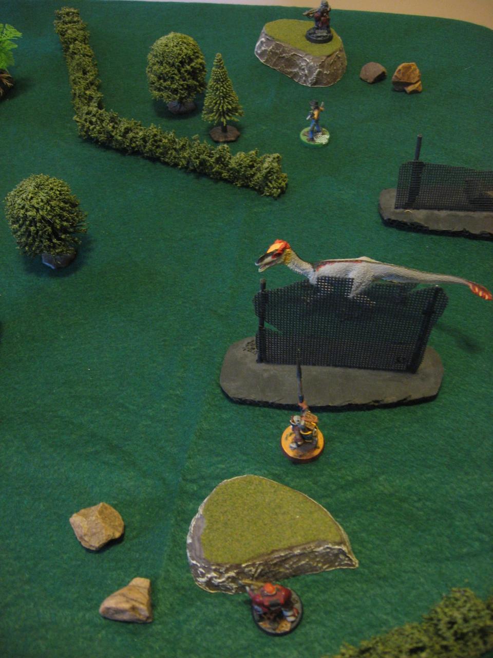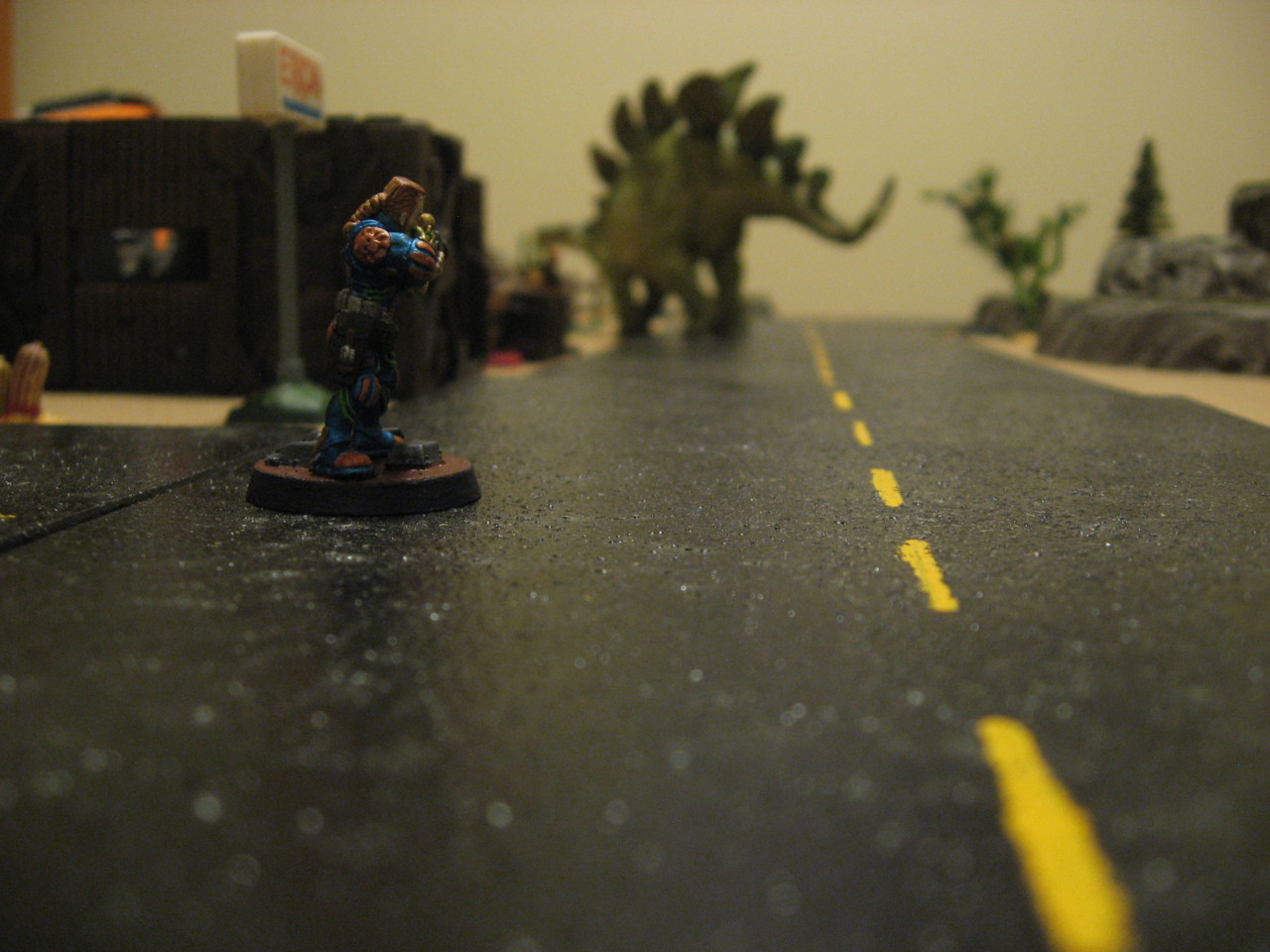 The strategy and plan was to rush and capture an objective and hurry it off the table with Skull Basher. Sort of a trade off since he ideally wants to be moving forward into melee, not away from the violence. But he’s also significantly faster than the rest of the human members. Otherwise the rest would setup a perimeter, rain down fire, and let the dinosaur distract and hold off the enemy.