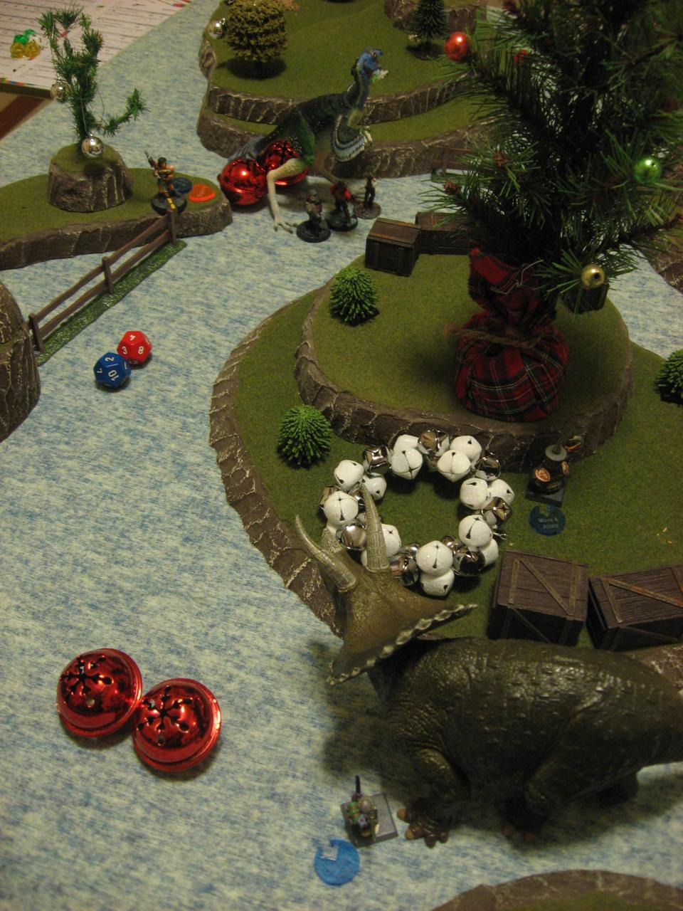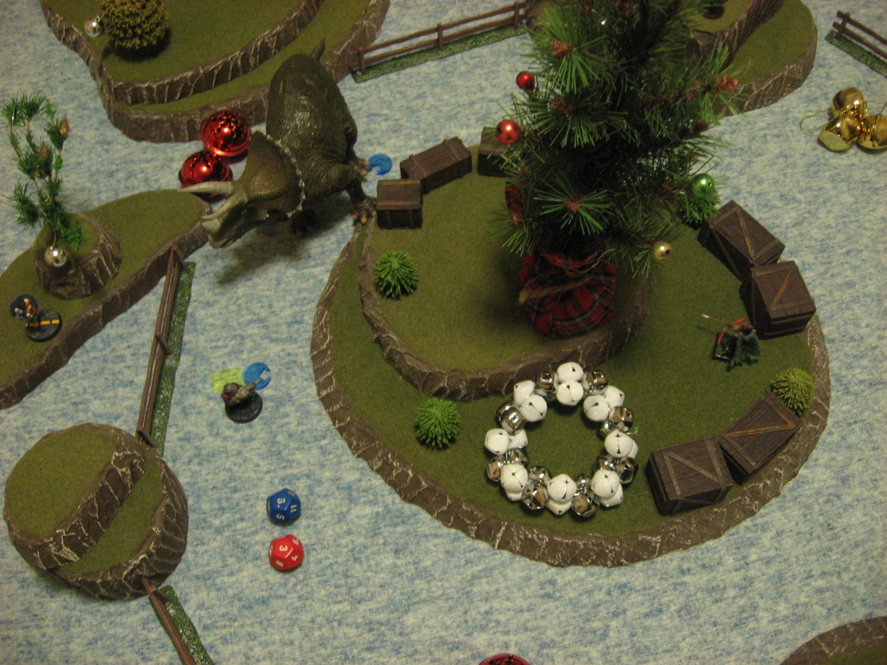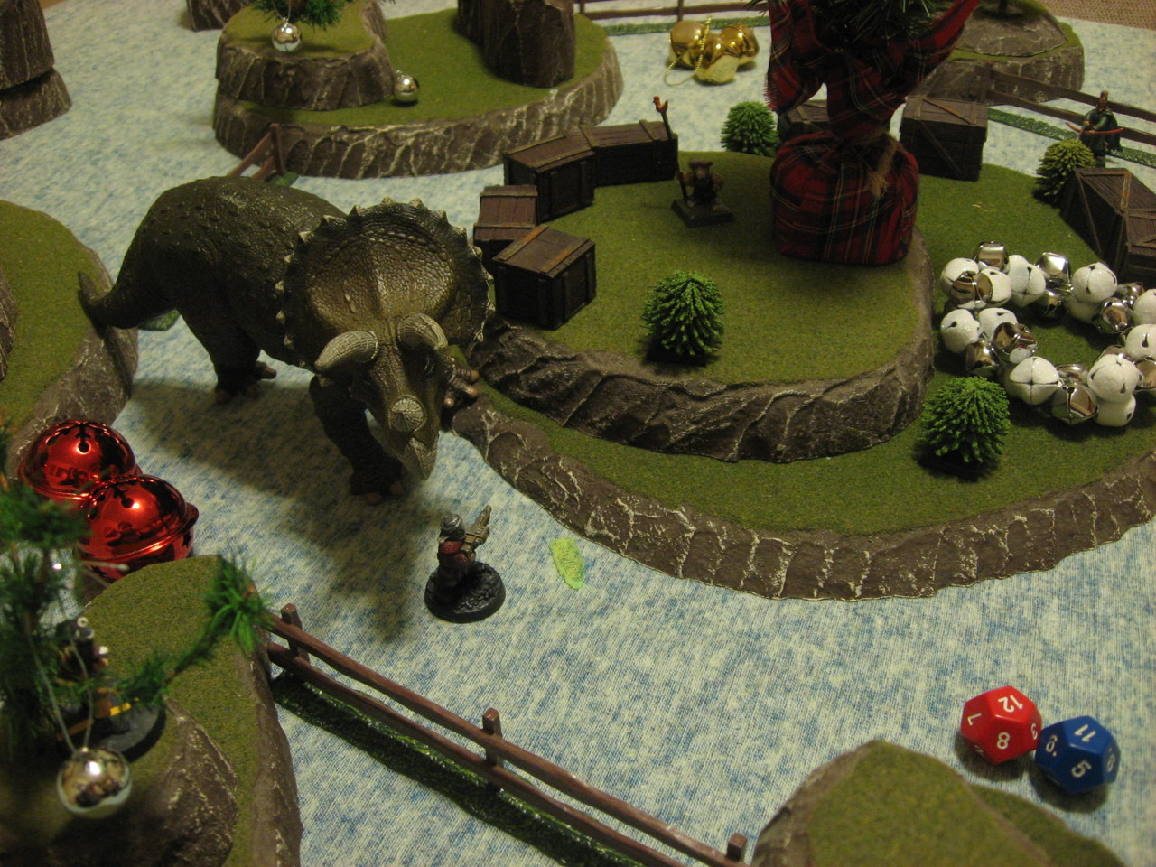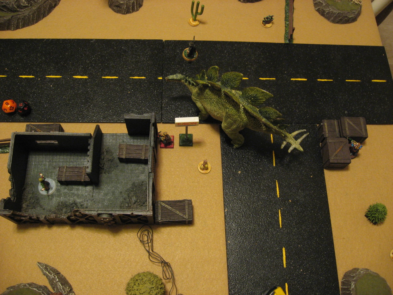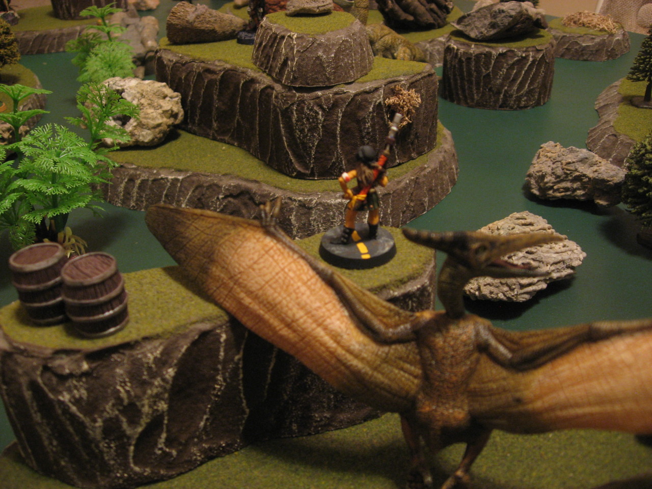 The strategy and plan was to rush and capture an objective and hurry it off the table with Skull Basher. Sort of a trade off since he ideally wants to be moving forward into melee, not away from the violence. But he’s also significantly faster than the rest of the human members. Otherwise the rest would setup a perimeter, rain down fire, and let the dinosaur distract and hold off the enemy.