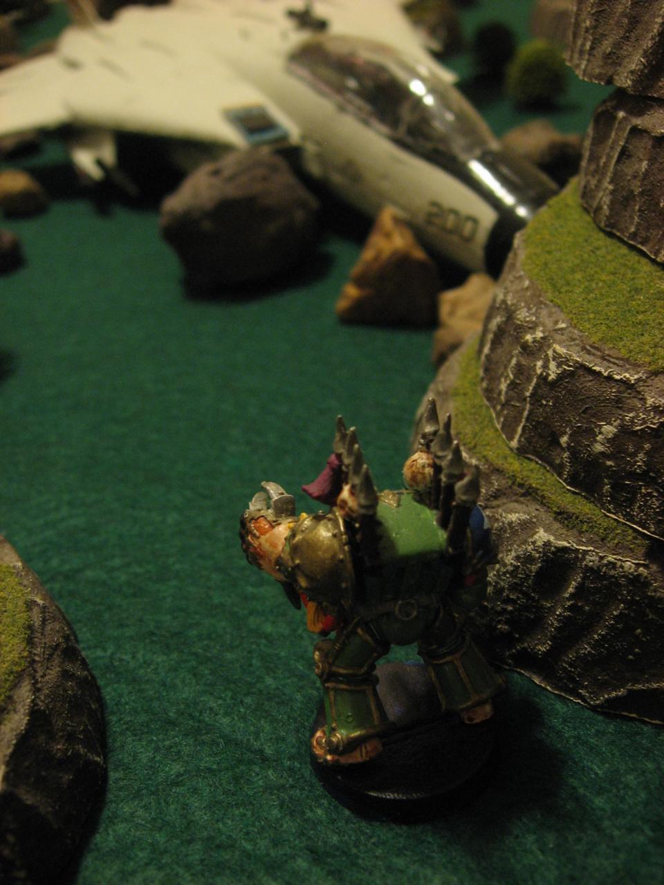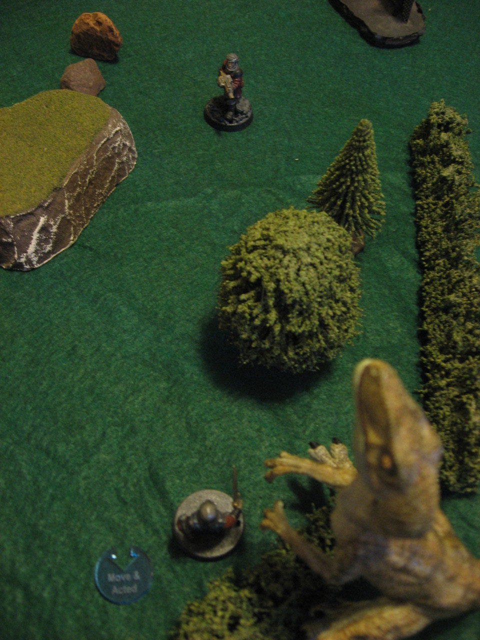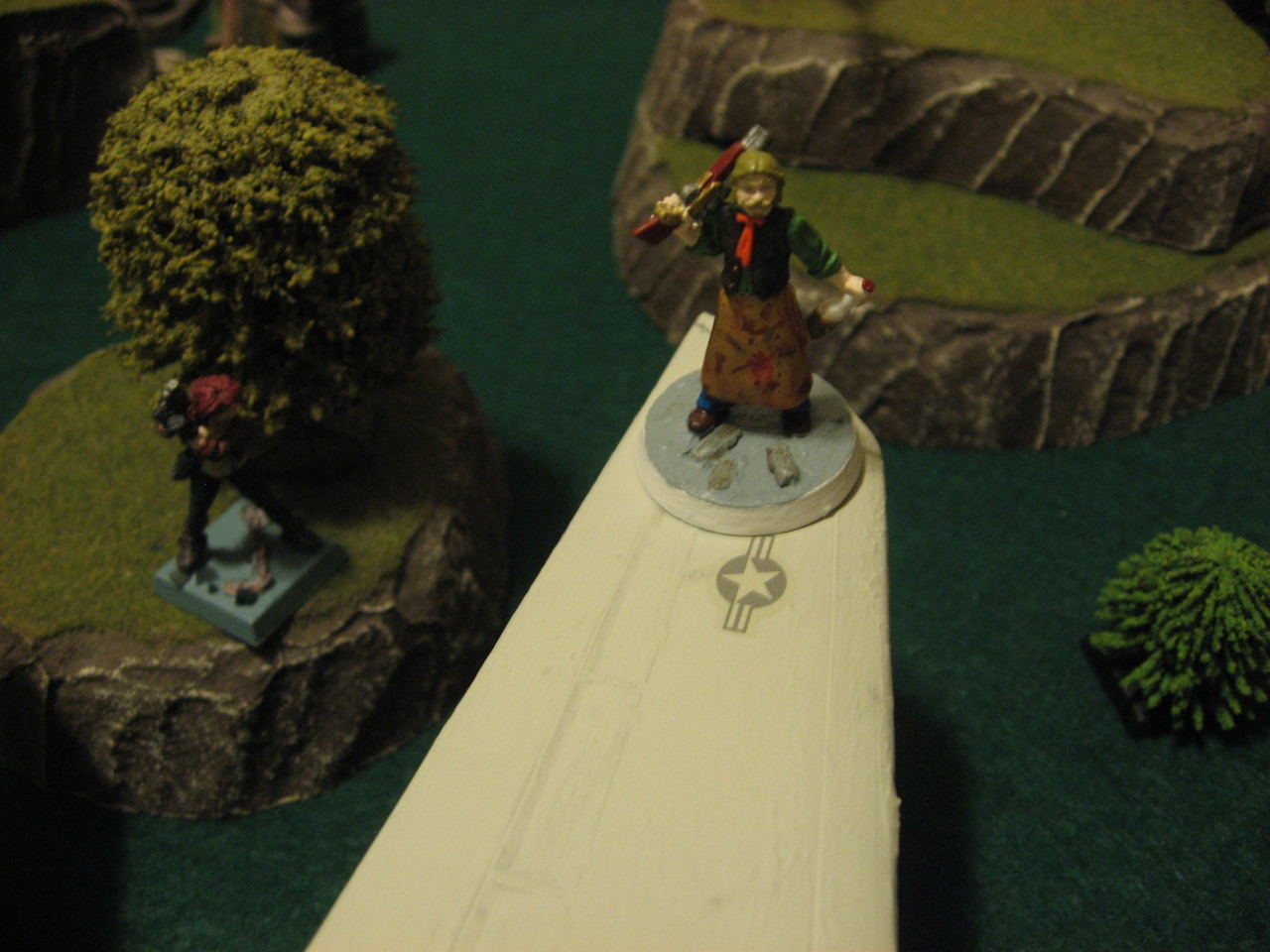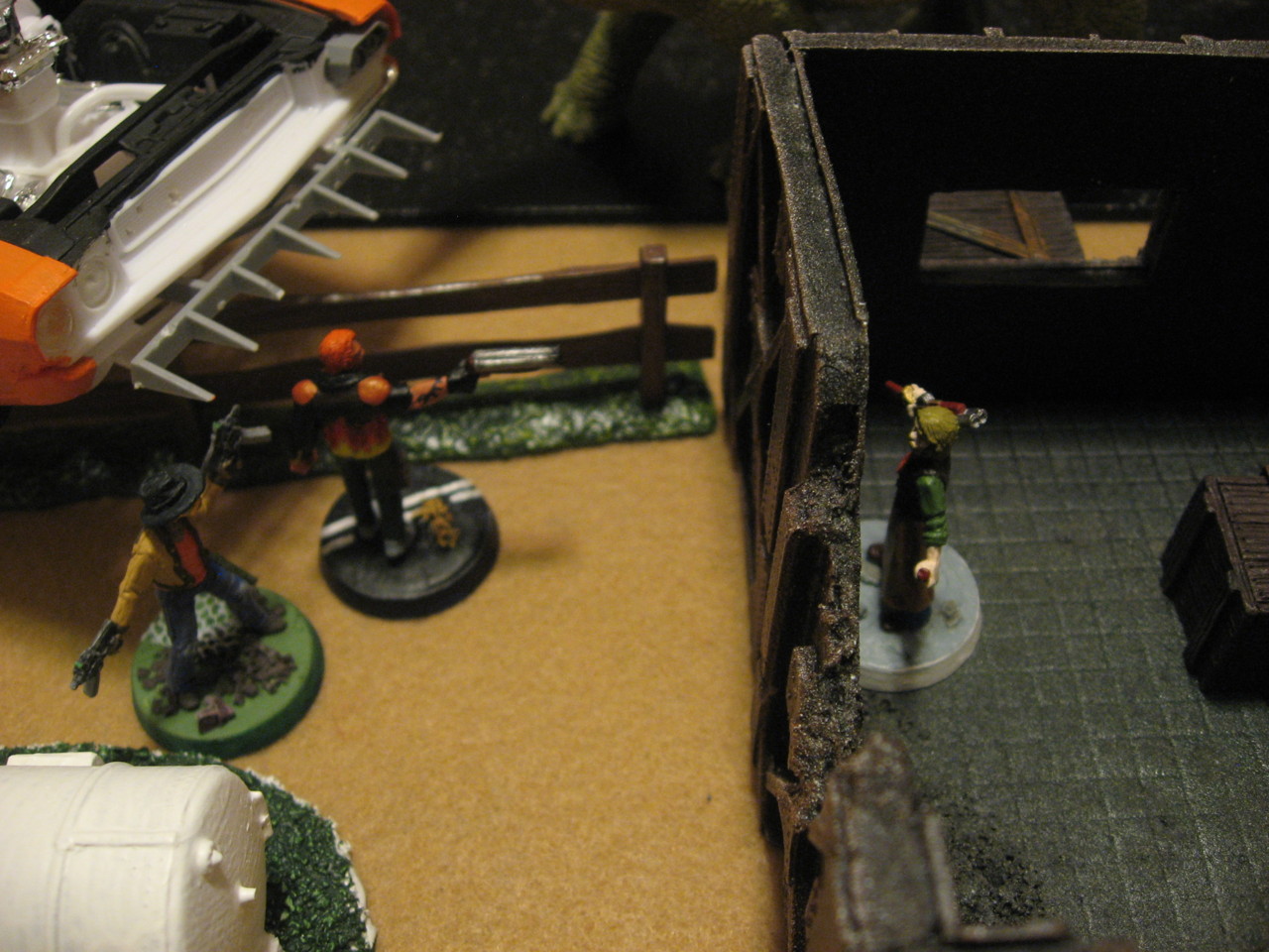 In terms of shooting at living things Powder Monkey managed a lucky hit on Iron Talon that caused Panic. The dinosaur had edged forward around the hill, but still presented a fairly big target. Iron Talon attempted a far 5″ Charge against Eiger, but failed and was a bit exposed. From on top of the hill Desolator hit Alexander Keith for 6 damage. The bartender then failed his Bravery Test and would be Fleeing. The Commando sniper had a fairly good view of the battlefield, but the F-14 Tomcat did a good job of blocking line of sight for some of the approach.