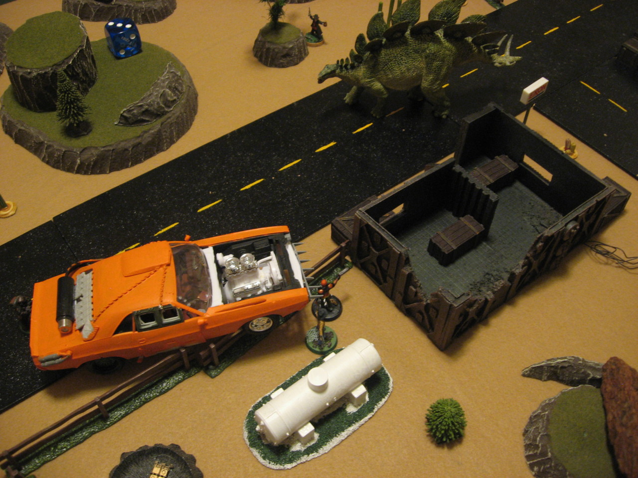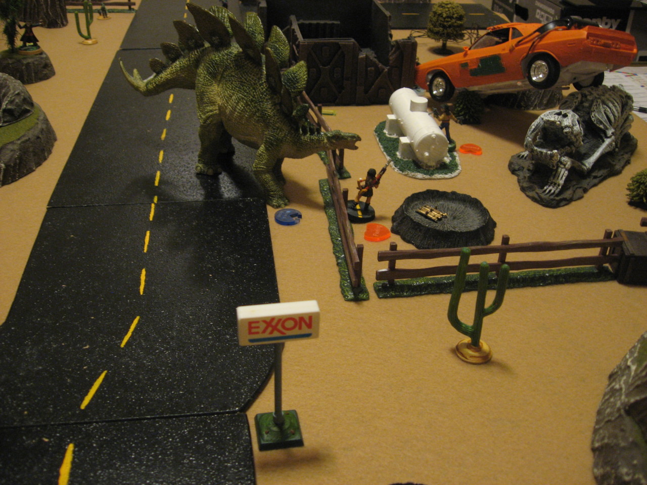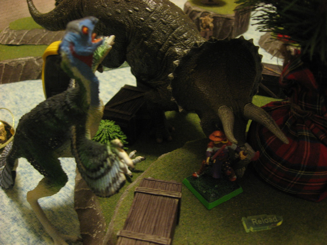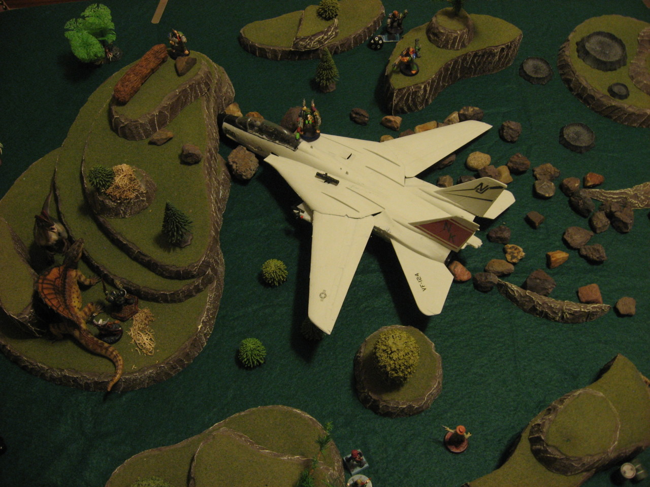 Finally a battle report! The elapsed time since my last game session here is criminally long, and well overdue for some new content. So I wrangled together a few posses, grabbed a pal, dug up an old childhood F-14 Tomcat airplane model, and set out to play some Dinosaur Cowboys v2.6!