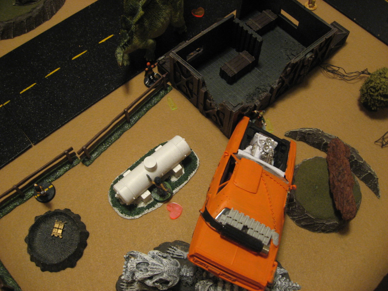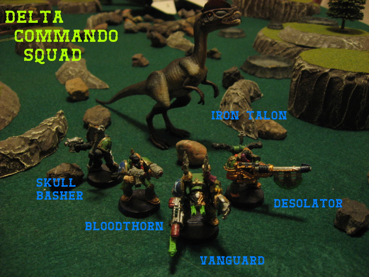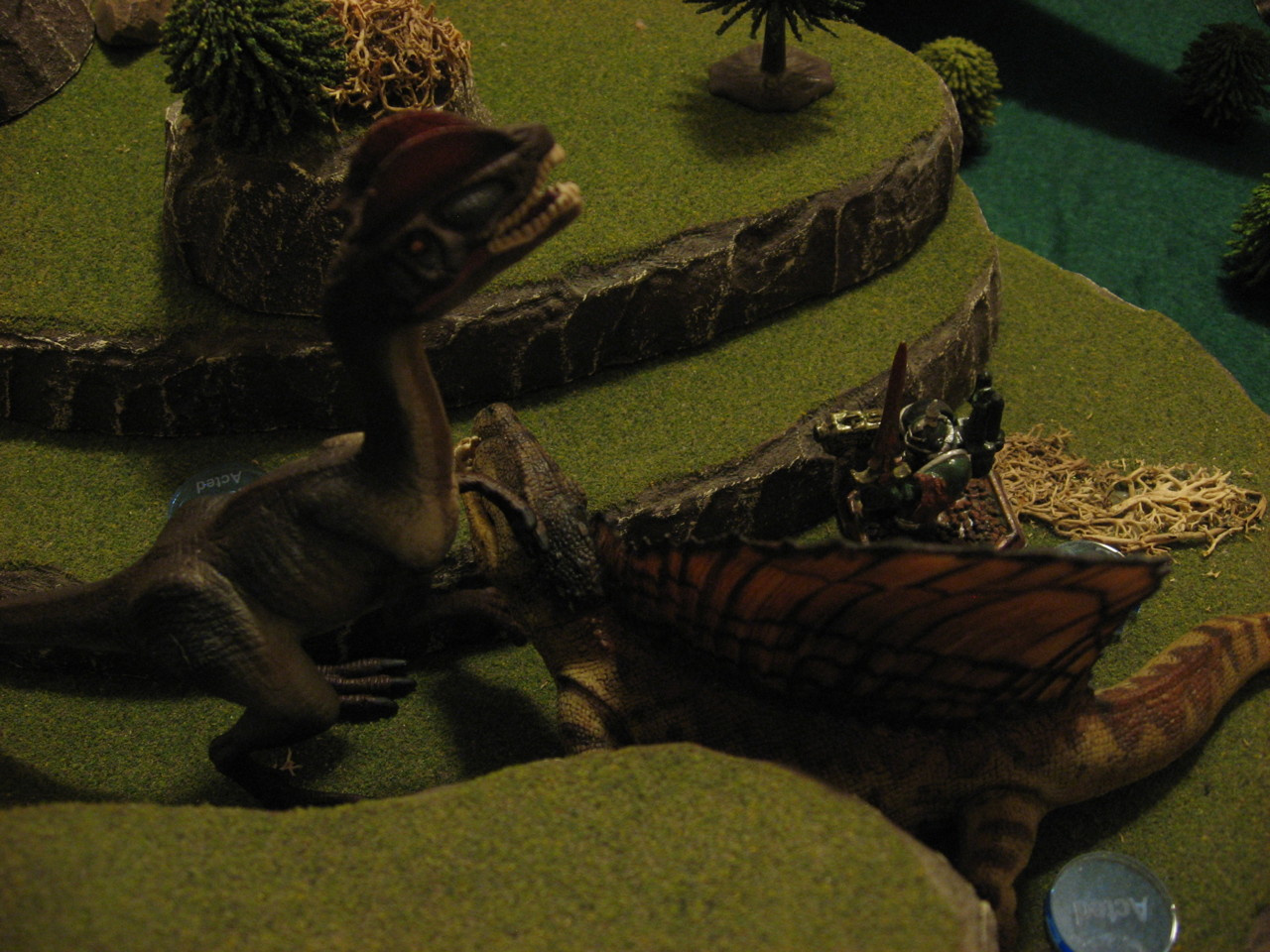 I busted out some old, old figures for this posse. Like high school era Plague Marines from Warhammer 40,000. One of the few times I tried to do a consistent, matching color scheme. I also used my new-ish Dilophosaurus toy dinosaur, made famous as the “spitter” from Jurassic Park.