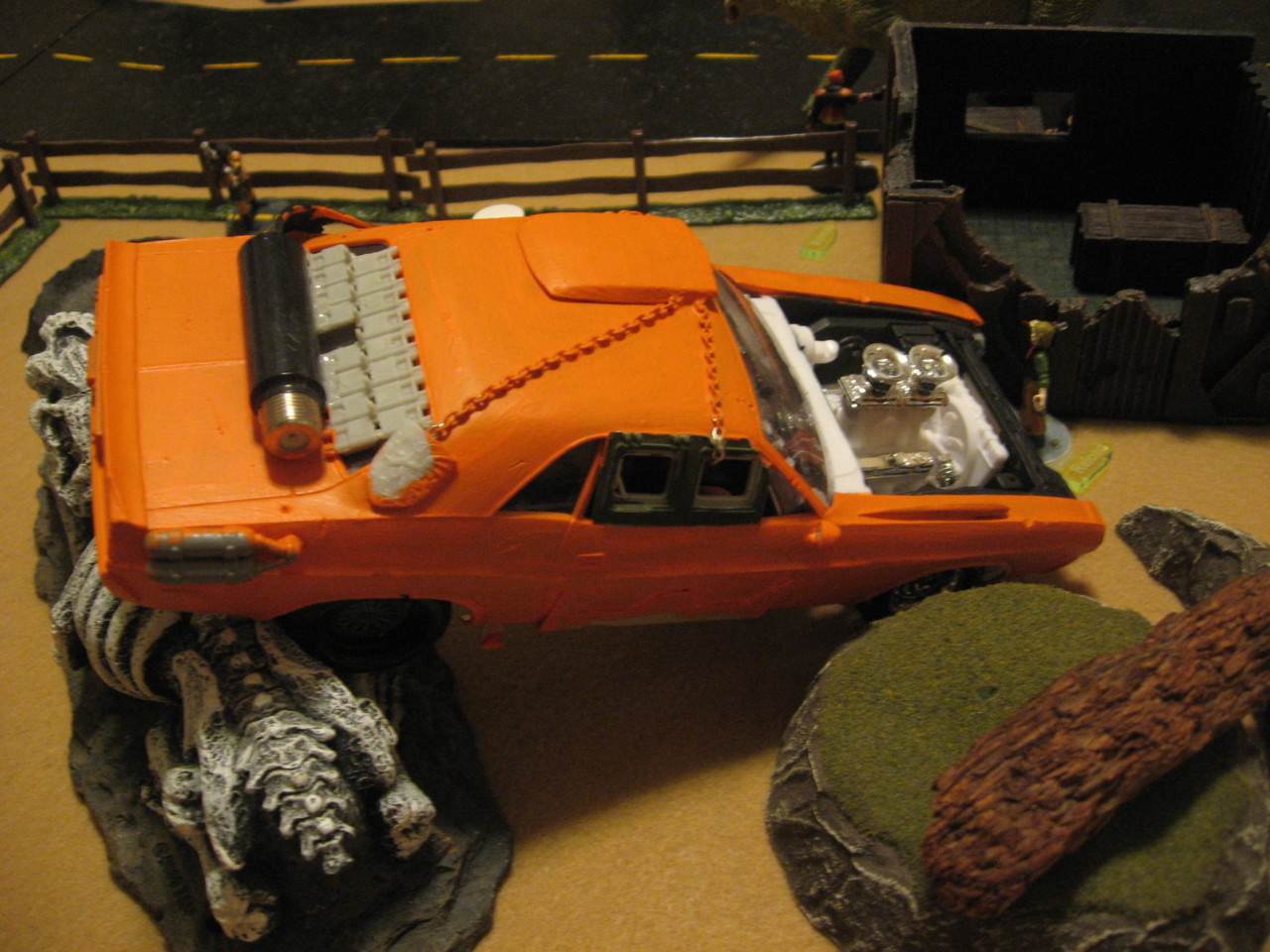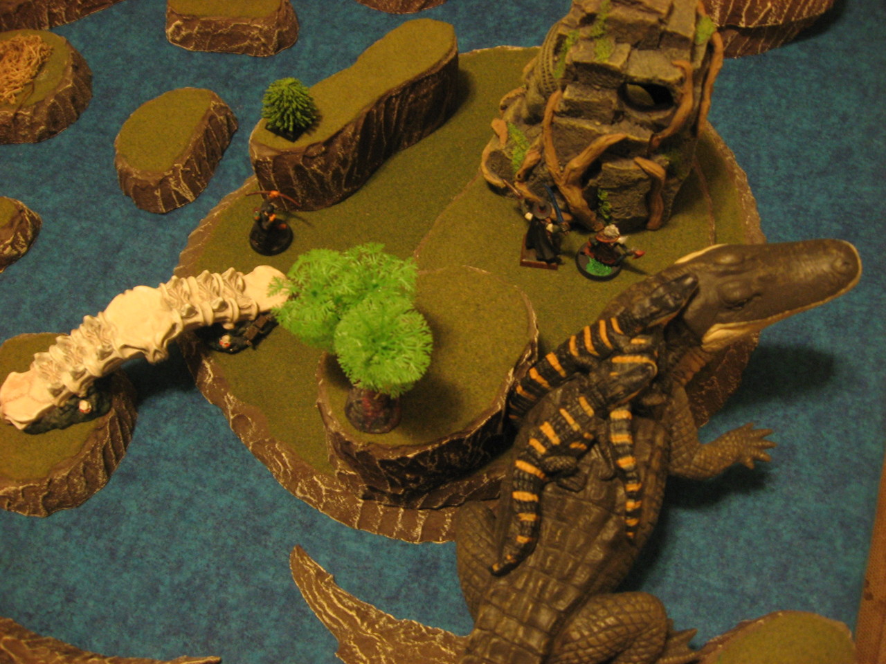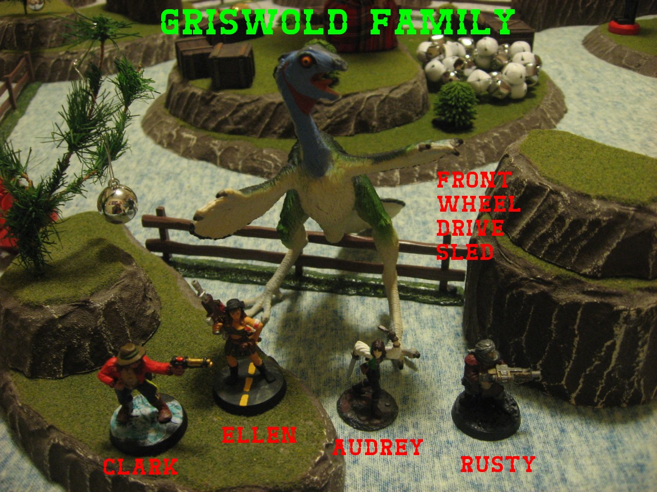 I busted out some old, old figures for this posse. Like high school era Plague Marines from Warhammer 40,000. One of the few times I tried to do a consistent, matching color scheme. I also used my new-ish Dilophosaurus toy dinosaur, made famous as the “spitter” from Jurassic Park.