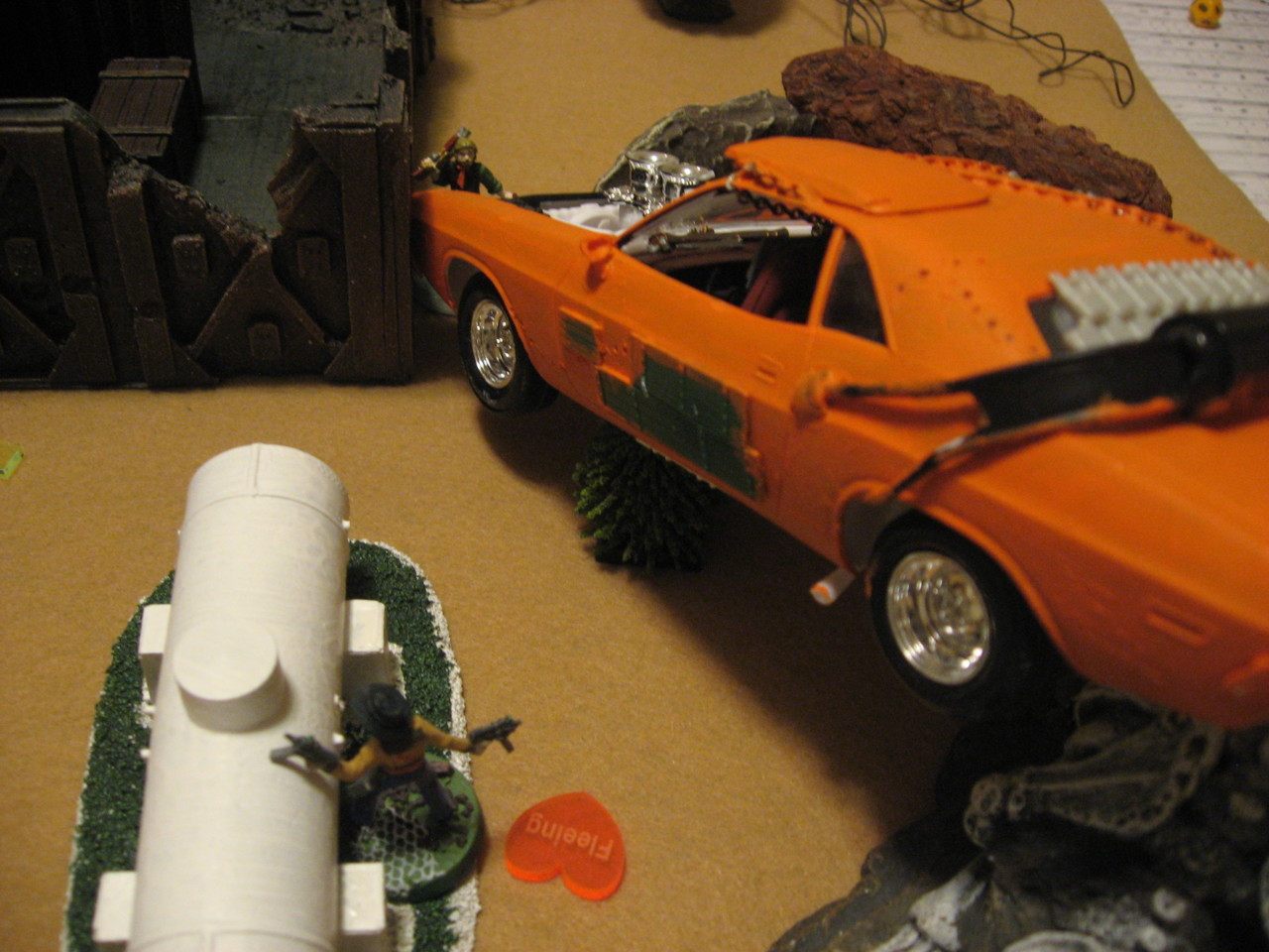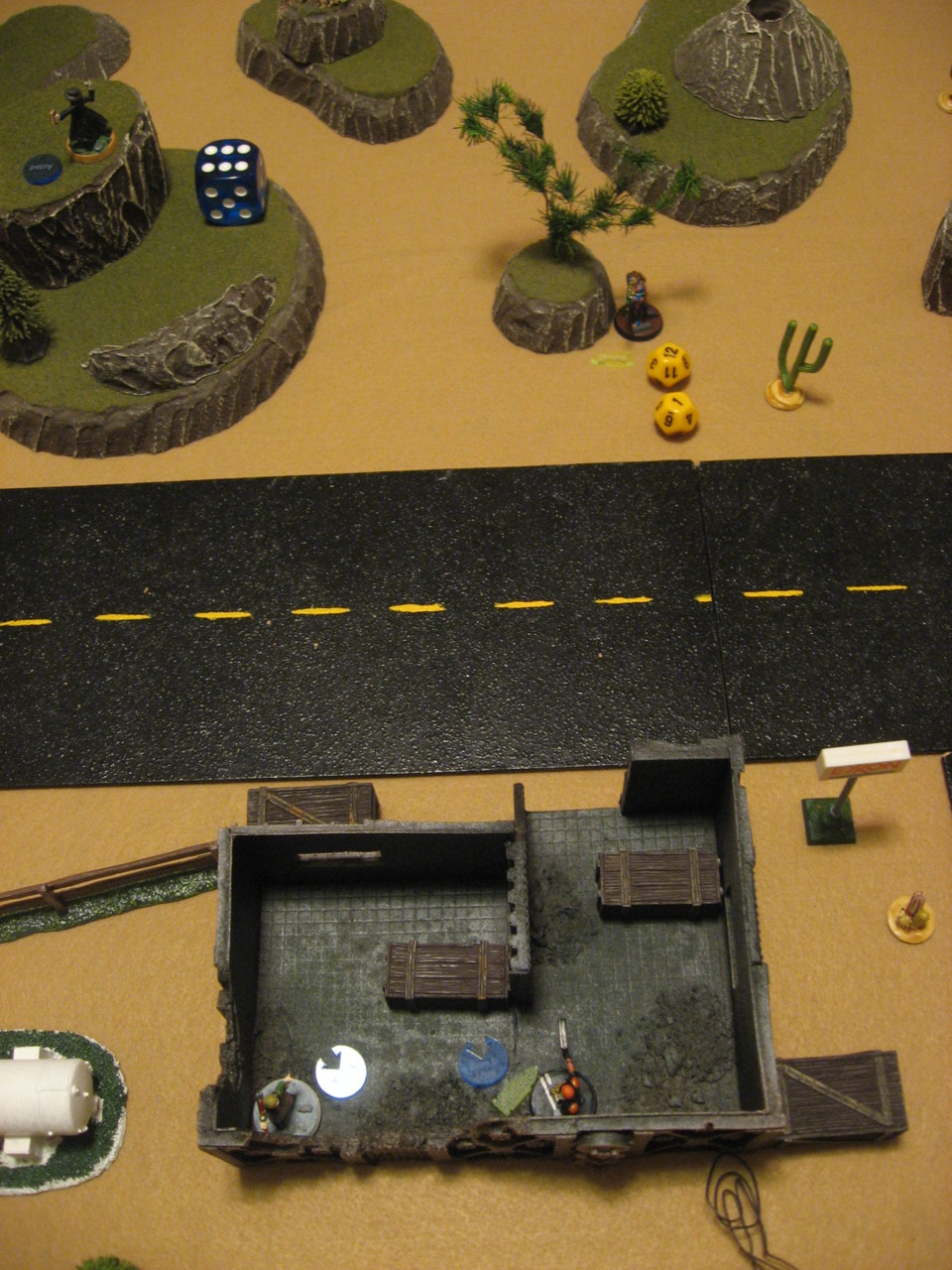 At this point the game was pretty much over, but the Eastwood Rovers player wanted to get a bit showy in how they kill Skull Basher. First they won initiative, and moved Alexander Keith to the Flare Gun mounted on the F-14 Tomcat. The intent was to get the Illuminate effect on Skull Basher, applying a -2 DEF penalty to make the rest of the posse hit a lot easier. But instead Keith got a Critical hit on the Flare Gun attack, resulting in 4 damage which killed Skull Basher!
