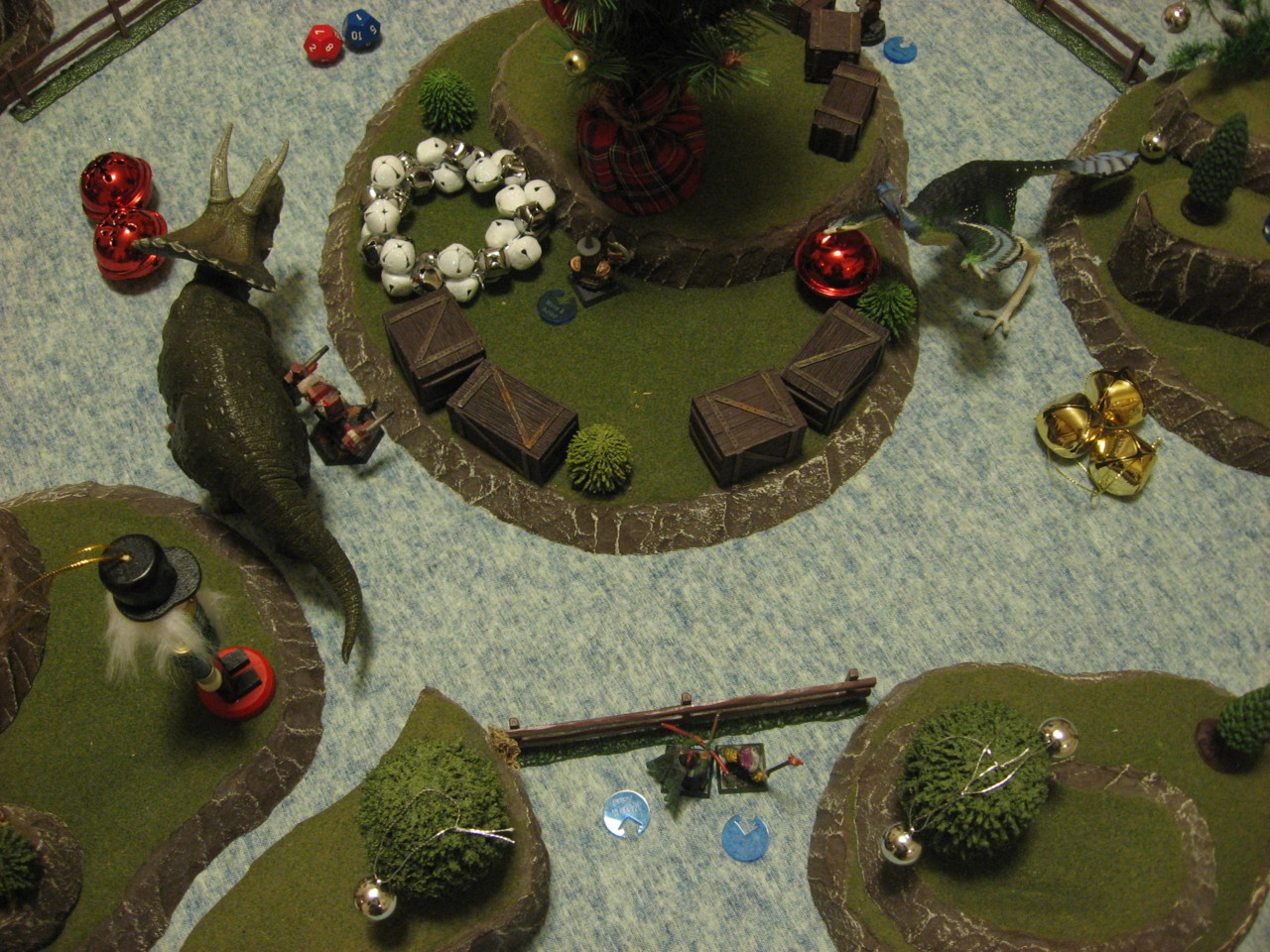 This turn the dinosaurs met in combat. For all the thematic dinosaur training and discpline, and both player’s idea of using the dinosaur to distract human enemies, the beasts still went right for each other and started tearing in. Iron Talon succeeded at his much closer 1″ Charge, hitting Eiger quite handily. Bloodthorn mounted the tall hill the F-14 Tomcat had crashed into, and fired down at Eiger. The Fin dinosaur took a pounding and was quickly down to 6 HP.