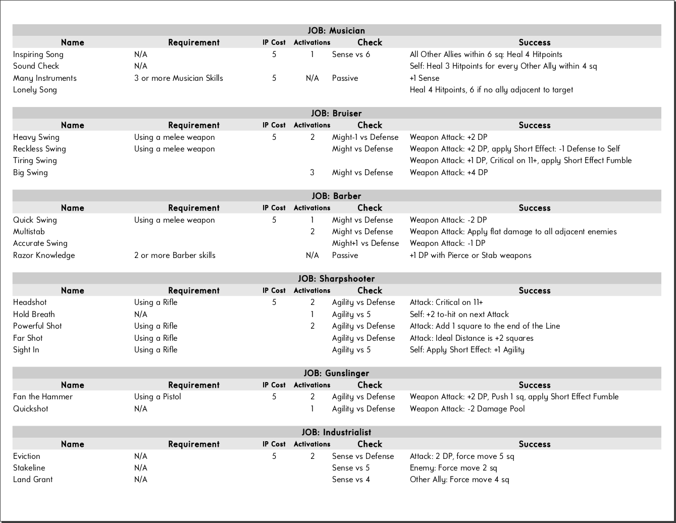 So with my RPG I want to do the same. Which means besides filling out a skeleton of a rulebook so far, I’ve also been working on the general list of Skills. I narrowed down the Jobs a bit to have actual names, cut a few, etc. I’ll be doing some re-theming to make some more suitable for the universe/history/theme. Obviously the document will get hugely formatted and touched up too.