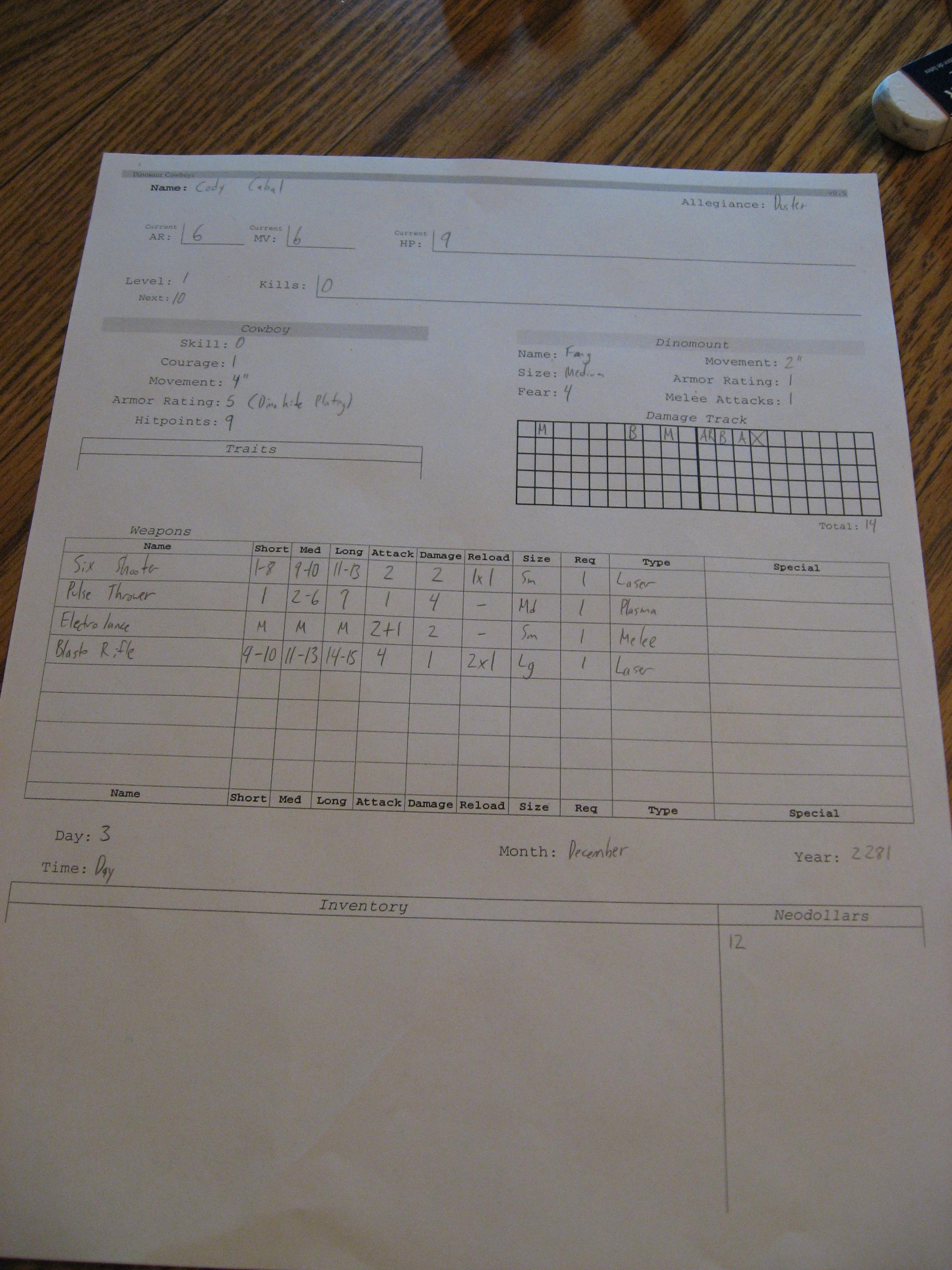 - Similarly weight/encumbrance isn’t managed, and every character has item slots. 3 Weapon, 1 Hat, 1 Neckwear, 1 Holster, 1 Clothing. Any excess equipment is put on the dinosaur. Minor items are not tracked or managed, or are already included in a Skill (for example Apply Bandage just has a bandage, you don’t need to manage them).